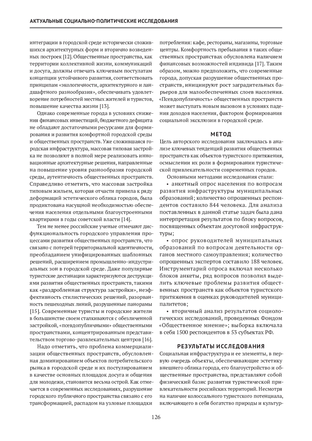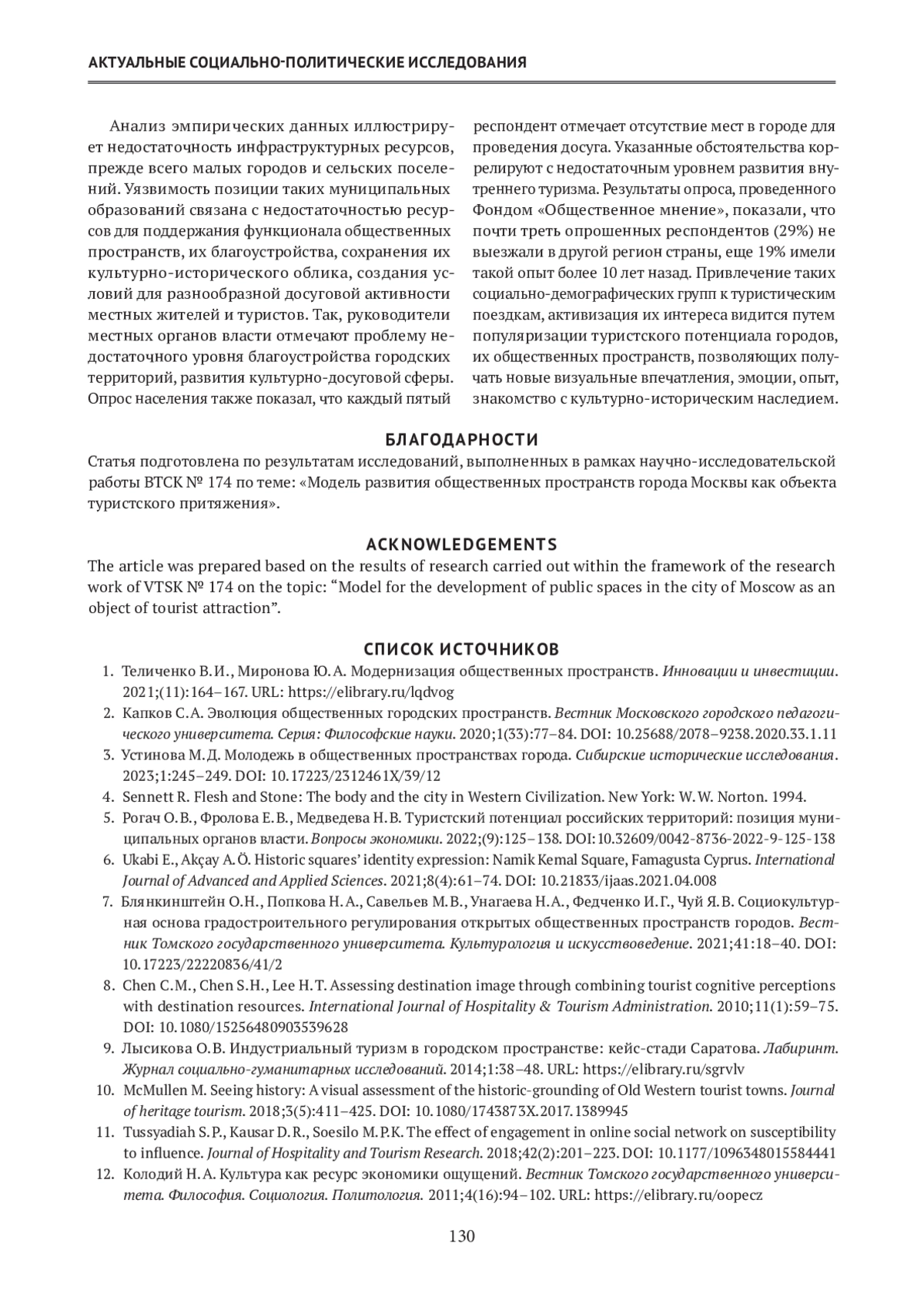 В статье рассматривается специфика развития общественных пространств современных городов как объектов туристского притяжения, анализируются ключевые проблемы и перспективы наращивания их потенциала. Роль общественных пространств в развитии внутреннего туризма определяется совокупностью факторов мотивации социальных субъектов при выборе туристских маршрутов прежде всего в контексте культурно-познавательного и событийного туризма. Наряду с когнитивно-рациональными факторами особую значимость представляет эмоционально-личностная мотивация туриста (потребность в сенсорном опыте, эмоциях, впечатлениях, визуальной привлекательности места). Результаты проведенных исследований позволили сделать вывод о наличии ряда дисфункций в развитии общественных пространств современных городов, их недостаточной визуальной и функциональной привлекательности для потенциального туриста. Дефициты финансовых средств в местных бюджетах не позволяют в полной мере поддерживать высокий уровень благоустройства общественных пространств прежде всего в малых городах. Каждый пятый опрошенный респондент в ходе исследования отметил недостаточность мест для проведения досуга. Одной из современных проблем функционирования общественных пространств становится их «переход» из публичных городских территорий в коммерциализированную зону торгово-развлекательных центров. В статье выделяются функции общественных пространств: интеграционная, коммуникационная, досуговая, социокультурная (создание условий реализации культурно-духовных интересов личности, поддержание разнообразия в городской среде), имиджевая (формирование территориального бренда и имиджа). Сделан вывод о необходимости фокусировки усилий местных органов власти на развитии общественных пространств как объектов туристского притяжения, повышении их визуальной привлекательности, аутентичности, своеобразия, активизации событийной повестки.