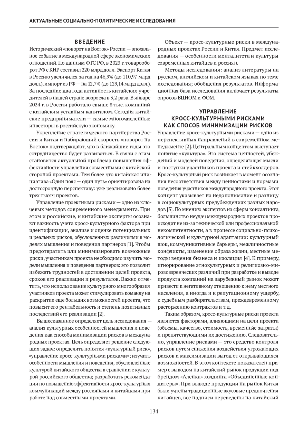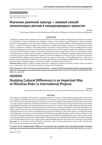 Углубление экономического сотрудничества между Россией с Китаем в рамках международных проектов указывает на потребность в новых инновационных подходах к оценке и минимизации рисков. Недооценка кросс-культурных рисков в международных проектах может привести к различного рода негативным последствиям. Цель исследования — изучение культурных особенностей мышления и поведения китайцев и россиян как способ минимизации рисков в совместных проектах. Автор обосновывает значимость кросс-культурных рисков в эффективности управления международными проектами. Осуществляет сравнительный анализ моделей мышления и поведения китайцев и россиян. Автор приходит к выводу, что социокультурная дистанция между Россией и Китаем достаточно глубока, что повышает риски недопонимания, ошибок и конфликтов. В рамках исследования проведен сравнительный анализ различий социокультурных особенностей моделей мышления и поведения китайцев и россиян. Учет данных различий способствует более эффективному управлению кросс-культурными проектами, а также формированию и укреплению доверия между партнерами. Разработаны конкретные рекомендации по повышению эффективности кросс-культурных коммуникаций между россиянами и китайцами в работе над совместными проектами.