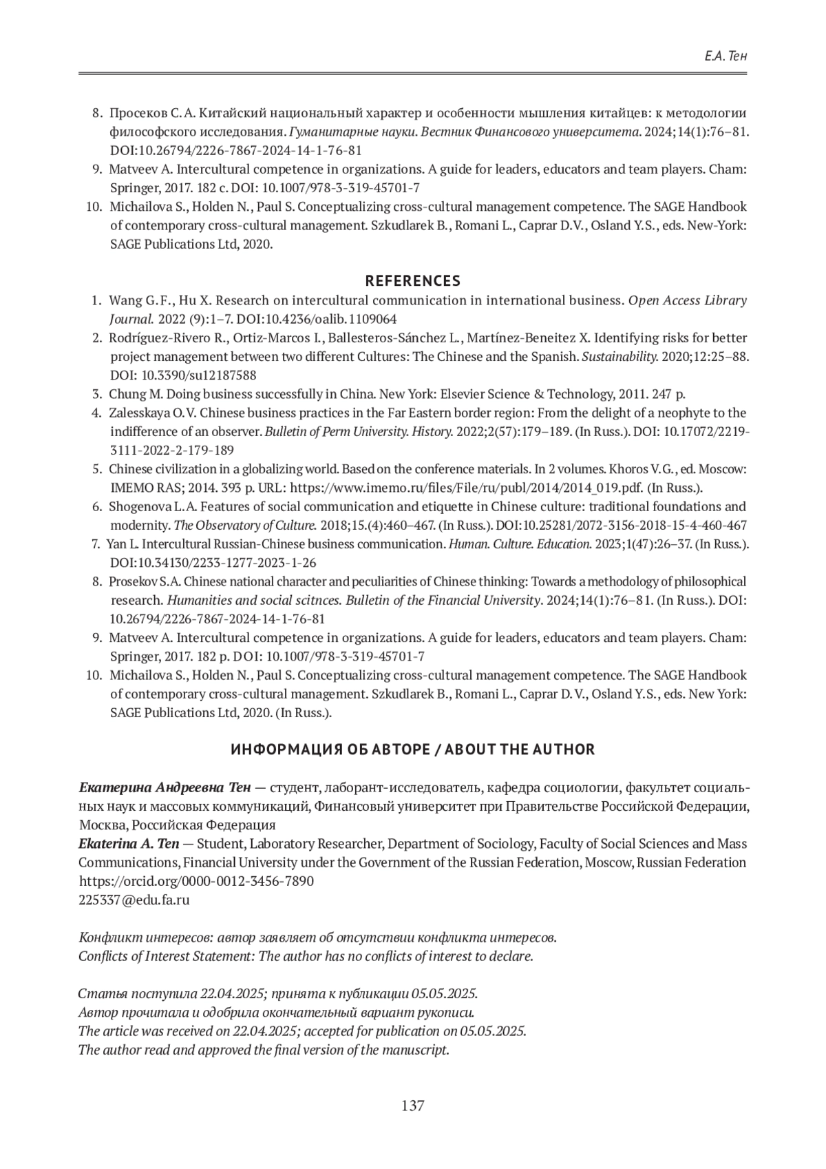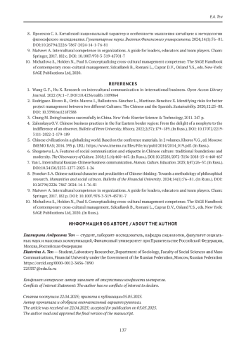 7. Янь Л. Межкультурная русско-китайская бизнес-коммуникация. Человек. Культура. Образование. 2023;1(47):26-37. https://doi.org/10.34130/2233-1277-2023-1-26