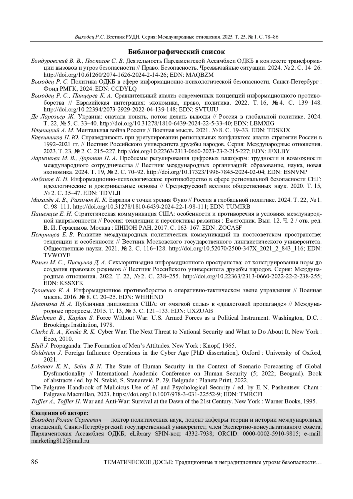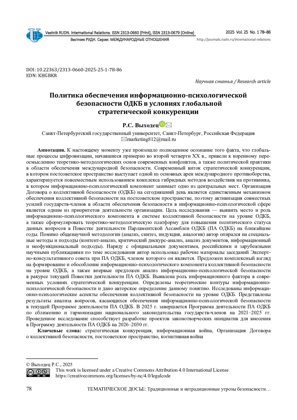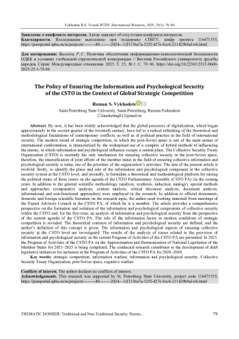 2. Выходец Р. С. Политика ОДКБ в сфере информационно-психологической безопасности. Санкт-Петербург: Фонд РМГК, 2024. EDN: CCDYLQ