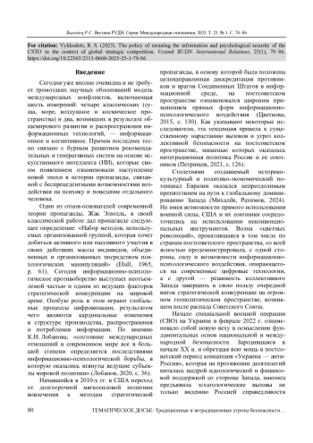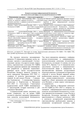 К настоящему моменту уже произошло полноценное осознание того факта, что глобальные процессы цифровизации, начавшиеся примерно во второй четверти ХХ в., привели к коренному переосмыслению теоретико-методологических основ современных конфликтов, а также политической практики в области обеспечения международной безопасности. Современный виток стратегической конкуренции, в котором постсоветское пространство выступает одной из основных арен международного противоборства, характеризуется повсеместным использованием комплекса гибридных методов воздействия на противника, в котором информационно-психологический компонент занимает одно из центральных мест. Организация Договора о коллективной безопасности (ОДКБ) на сегодняшний день является единственным механизмом обеспечения коллективной безопасности на постсоветском пространстве, поэтому активизация совместных усилий государств-членов в области обеспечения безопасности в информационно-психологической сфере является одним из приоритетов деятельности организации.