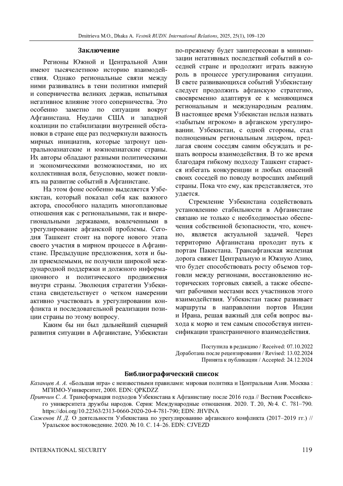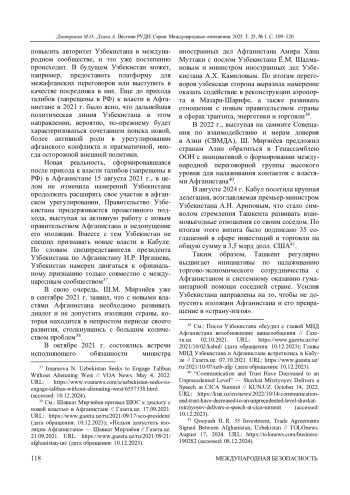 2. Притчин С. А. Трансформация подходов Узбекистана к Афганистану после 2016 года // Вестник Российского университета дружбы народов. Серия: Международные отношения. 2020. Т. 20, № 4. C. 781-790. ;. DOI: 10.22363/2313-0660-2020-20-4-781-790 EDN: JHVINA