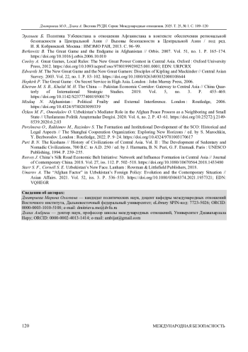 16. Umarov A. The “Afghan Factor” in Uzbekistan’s Foreign Policy: Evolution and the Contemporary Situation // Asian Affairs. 2021. Vol. 52, iss. 3. P. 536-553. ;. DOI: 10.1080/03068374.2021.1957321 EDN: VQHEGR