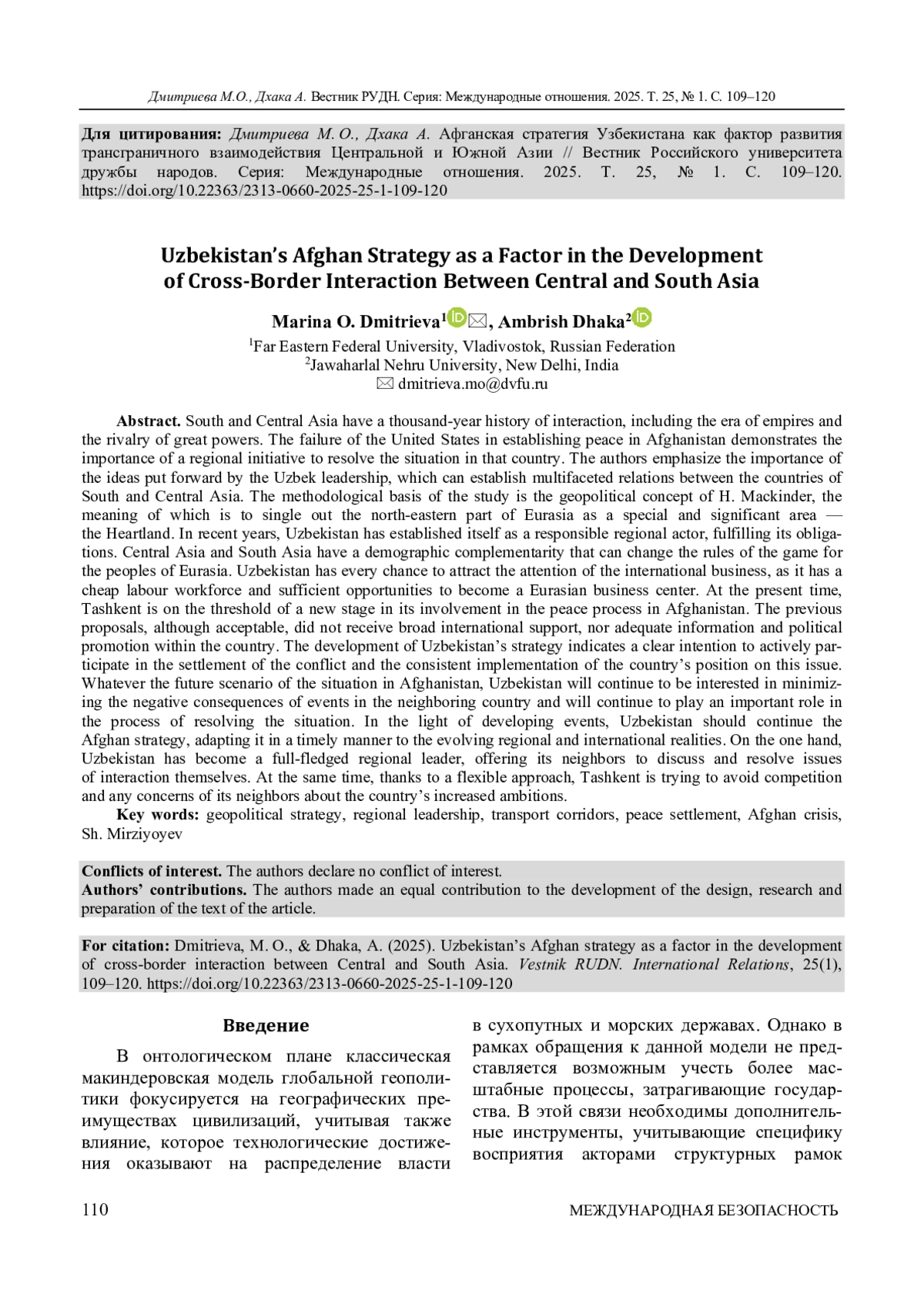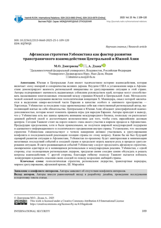 Южная и Центральная Азия имеют тысячелетнюю историю взаимодействия, которая включает эпоху империй и соперничества великих держав. Неудачи США в установлении мира в Афганистане демонстрируют важность региональной инициативы по урегулированию ситуации в этой стране. Авторы подчеркивают значимость выдвигаемых узбекским руководством идей, которые могут способствовать налаживанию многоплановых отношений между странами Южной и Центральной Азии. Методологической основой исследования является геополитическая концепция Х. Макиндера, смысл которой заключается в выделении северо-восточной части Евразии в качестве особого и значимого пространства - Хартленда. Узбекистан за последние годы зарекомендовал себя как ответственный региональный актор, выполняющий взятые на себя обязательства. Центральная и Южная Азия обладают демографической взаимодополняемостью, которая может изменить правила игры для народов Евразии. Авторы приходят к выводу, что у Узбекистана есть все шансы привлечь внимание международного бизнеса, поскольку он располагает дешевой рабочей силой и достаточными возможностями для того, чтобы стать евразийским деловым центром. Сегодня Ташкент стоит на пороге нового этапа своего участия в мирном процессе в Афганистане. Предыдущие предложения, хотя и были приемлемыми, не получили широкой международной поддержки и адекватного информационного и политического продвижения внутри страны. Установлено, что эволюция стратегии Узбекистана свидетельствует о четком намерении активно участвовать в урегулировании конфликта и последовательной реализации позиции страны по этому вопросу. Каким бы ни был будущий сценарий развития ситуации в Афганистане, Узбекистан по-прежнему будет заинтересован в минимизации негативных последствий событий в соседней стране и продолжит играть важную роль в процессе урегулирования ситуации. В свете развивающихся событий Узбекистану следует продолжить афганскую стратегию, своевременно адаптируя ее к меняющимся региональным и международным реалиям. Узбекистан, с одной стороны, стал полноценным региональным лидером, предлагая своим соседям самим обсуждать и решать вопросы взаимодействия. С другой стороны, благодаря гибкому подходу Ташкент пытается избежать конкуренции и развеять опасения своих соседей по поводу возросших амбиций страны.