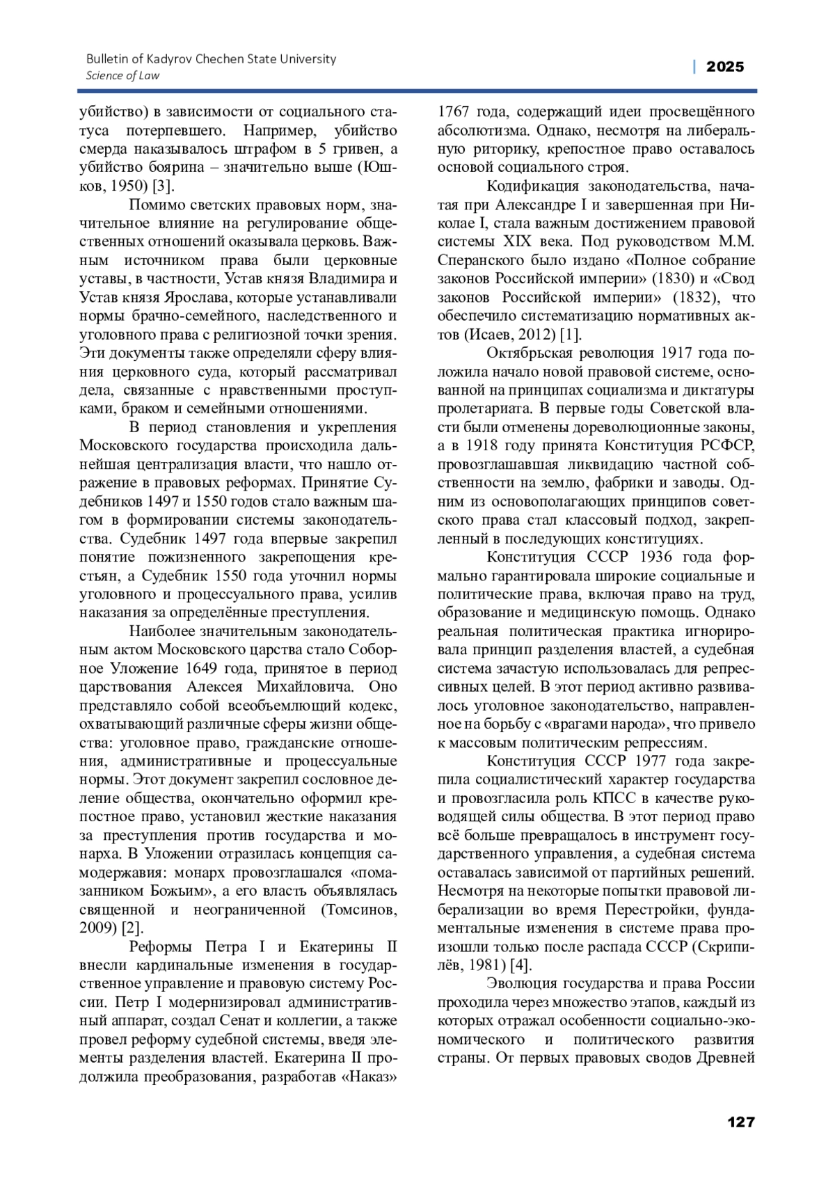 Статья посвящена комплексному исследованию предмета «История государства и права России» как научной дисциплины, изучающей процессы формирования и трансформации государственных институтов и правовых систем на различных этапах отечественной истории. Авторы анализируют ключевые периоды развития российской государственности, выделяют факторы, повлиявшие на становление правовых традиций, и рассматривают роль историко-правовых исследований в контексте современной юридической науки. В работе использованы сравнительно-исторический и системный методы, а также междисциплинарный подход, объединяющий правоведение и историю. Особое внимание уделено трудам российских учёных, таких как И. А. Исаев, В. А. Томсинов и С. В. Юшков, чьи исследования легли в основу понимания эволюции российского права. Результаты исследования подчёркивают преемственность правовых норм и их адаптацию к меняющимся социально-политическим условиям. Статья адресована юристам, историкам и всем, кто интересуется проблемами отечественной государственности.