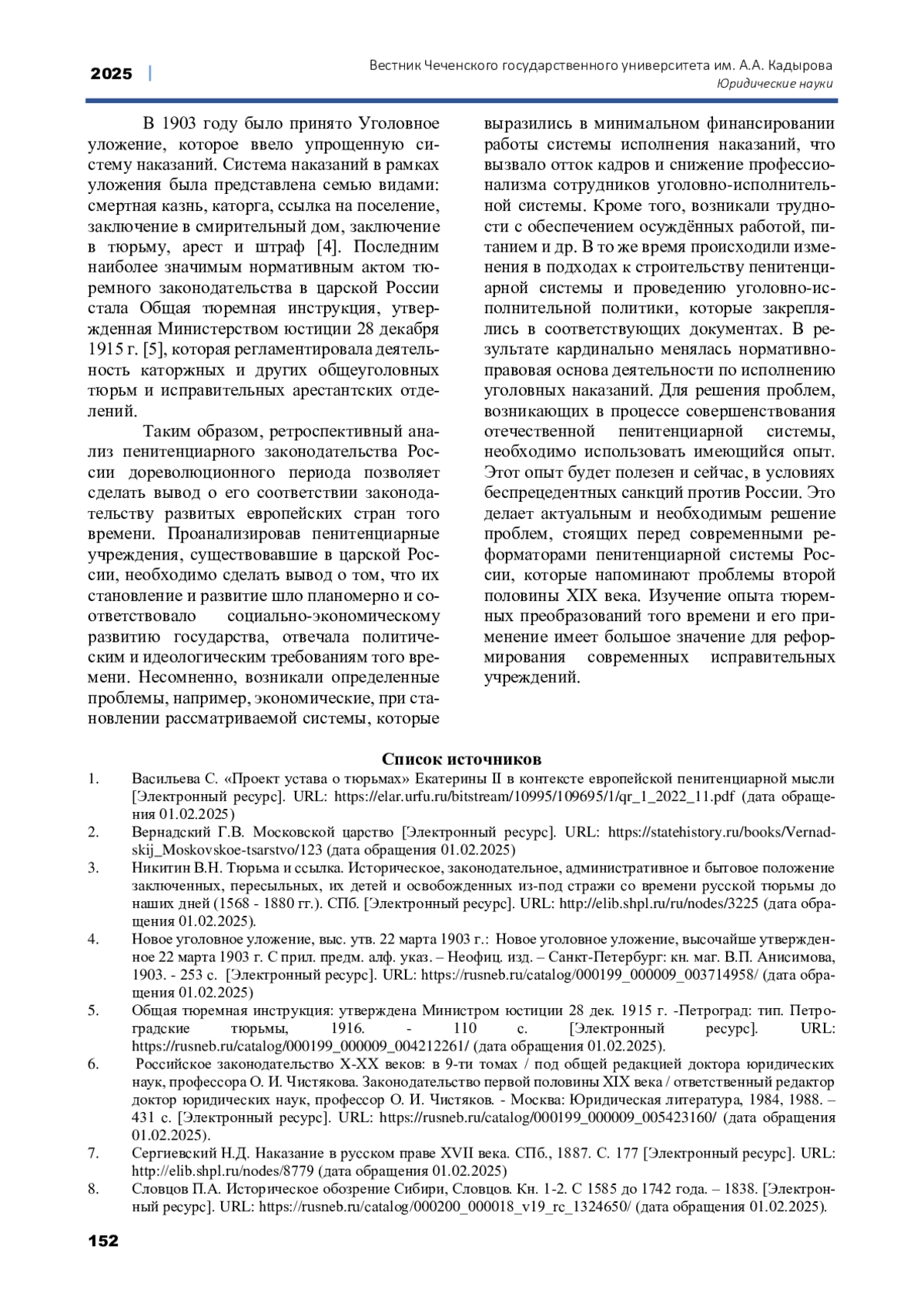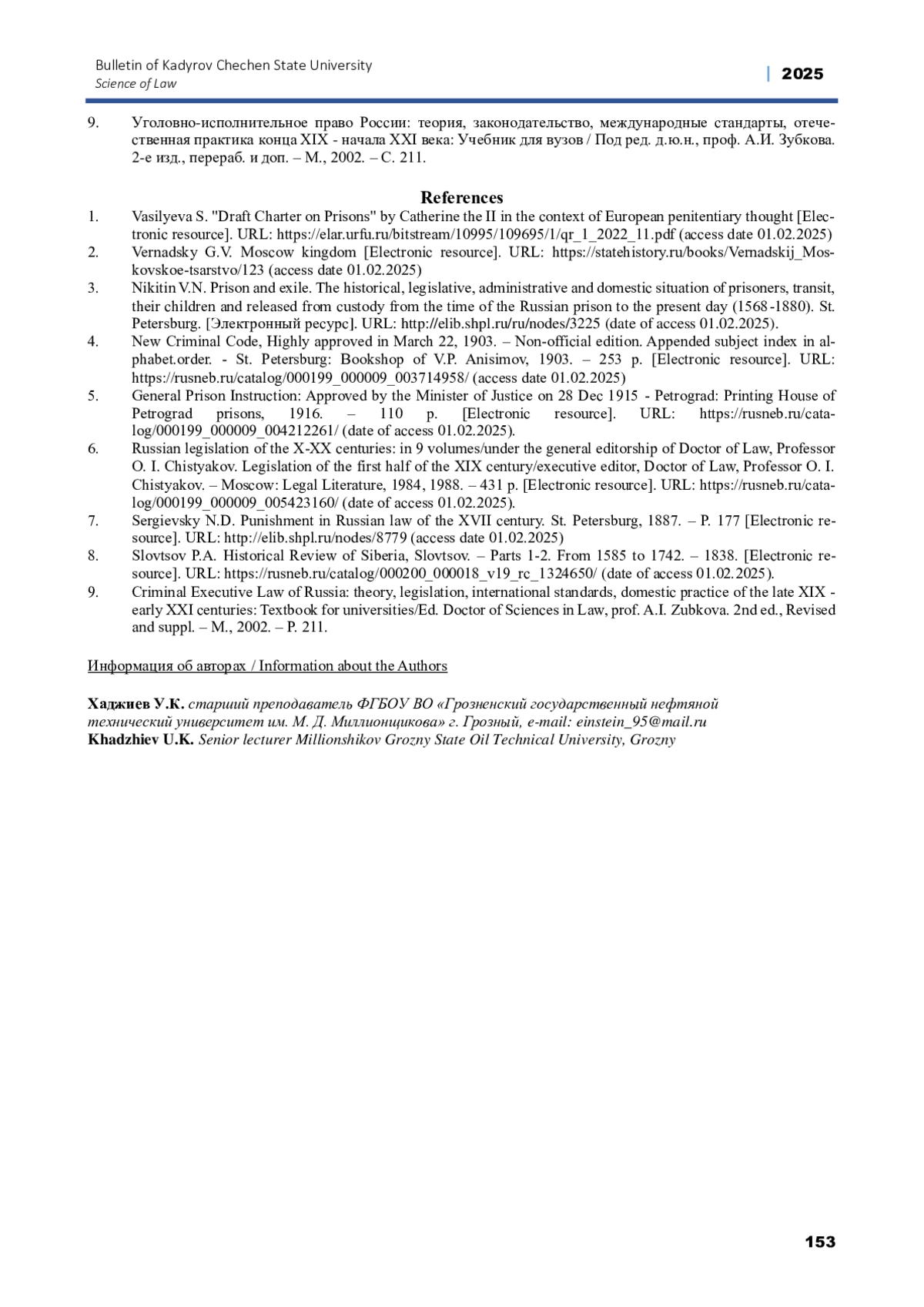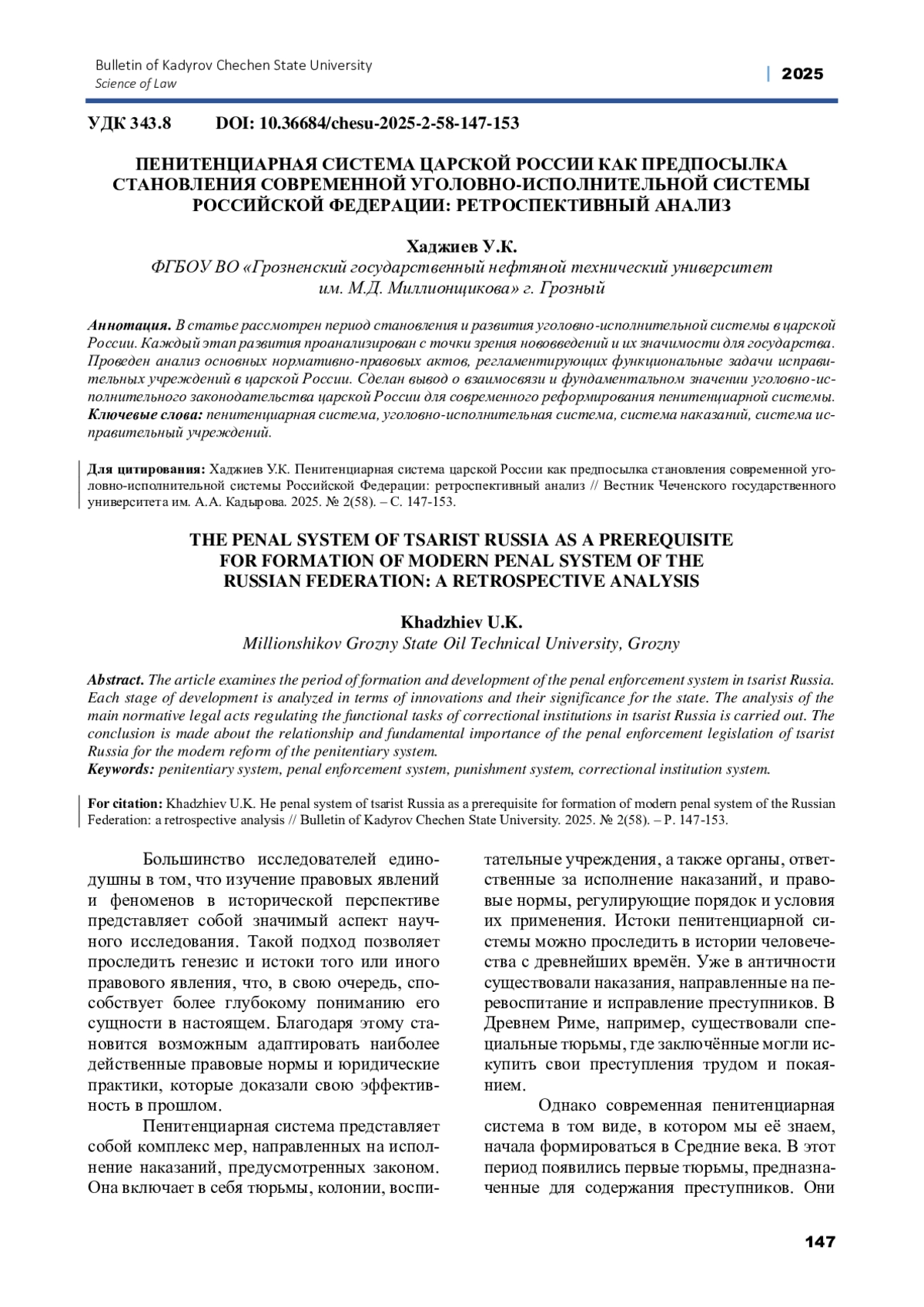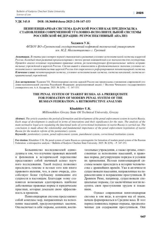 ХАДЖИЕВ У.К. ПЕНИТЕНЦИАРНАЯ СИСТЕМА ЦАРСКОЙ РОССИИ КАК ПРЕДПОСЫЛКА СТАНОВЛЕНИЯ СОВРЕМЕННОЙ УГОЛОВНО-ИСПОЛНИТЕЛЬНОЙ СИСТЕМЫ РОССИЙСКОЙ ФЕДЕРАЦИИ: РЕТРОСПЕКТИВНЫЙ АНАЛИЗ // ВЕСТНИК ЧЕЧЕНСКОГО ГОСУДАРСТВЕННОГО УНИВЕРСИТЕТА ИМ. А. А. КАДЫРОВА. 2025. № 2 (58)