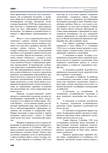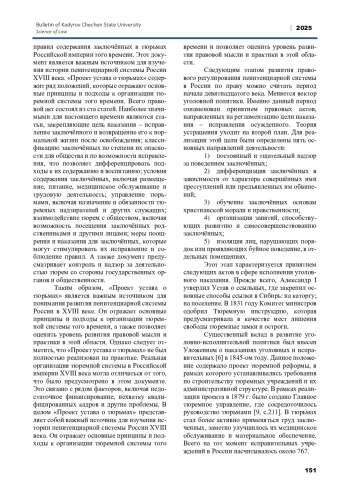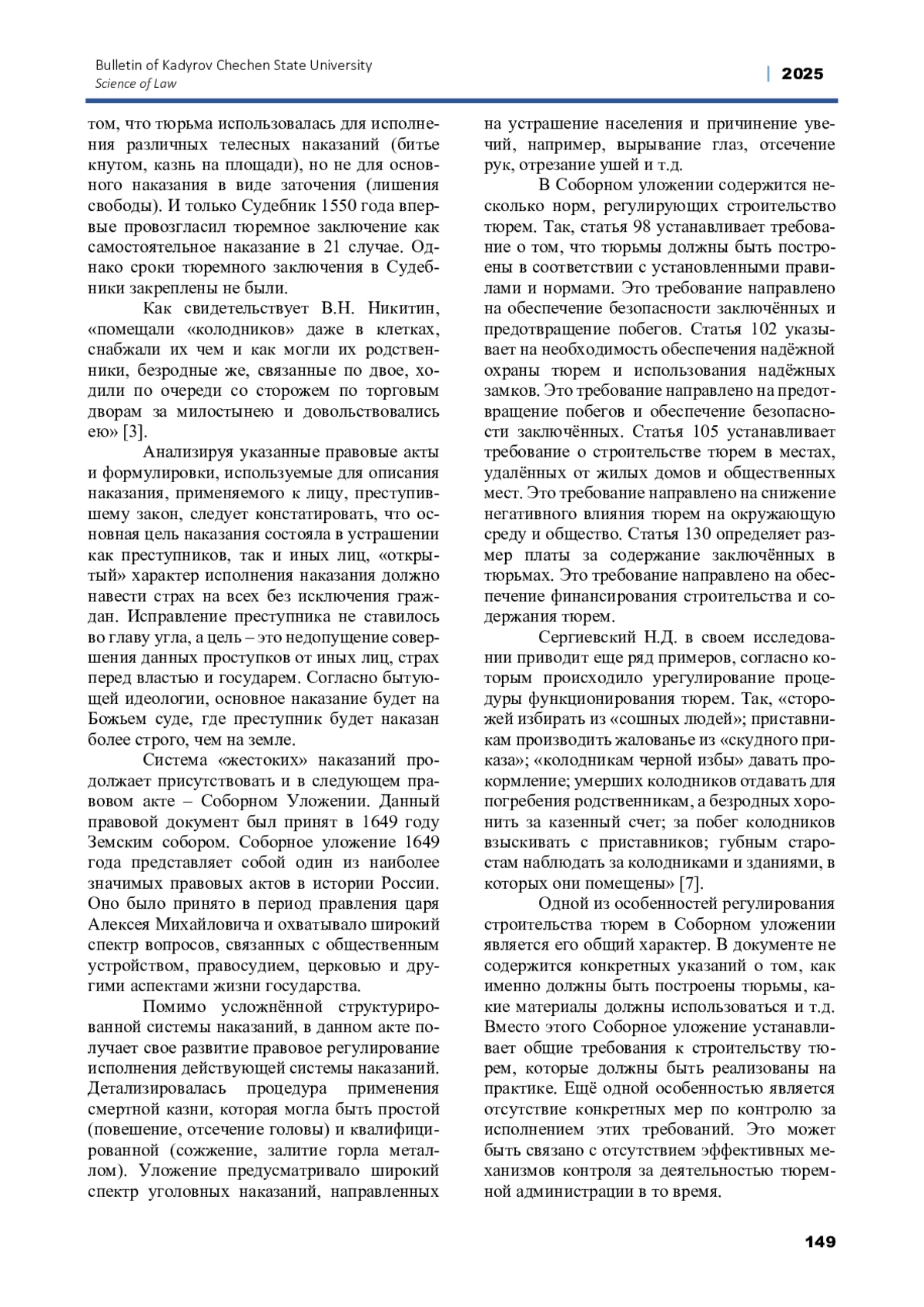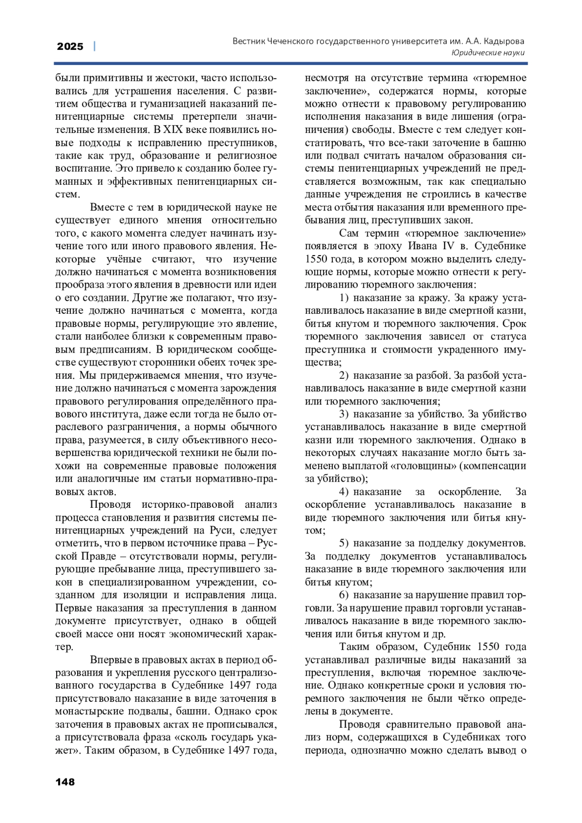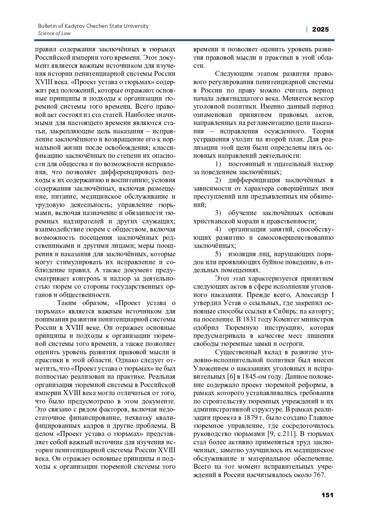 ХАДЖИЕВ У.К. ПЕНИТЕНЦИАРНАЯ СИСТЕМА ЦАРСКОЙ РОССИИ КАК ПРЕДПОСЫЛКА СТАНОВЛЕНИЯ СОВРЕМЕННОЙ УГОЛОВНО-ИСПОЛНИТЕЛЬНОЙ СИСТЕМЫ РОССИЙСКОЙ ФЕДЕРАЦИИ: РЕТРОСПЕКТИВНЫЙ АНАЛИЗ // ВЕСТНИК ЧЕЧЕНСКОГО ГОСУДАРСТВЕННОГО УНИВЕРСИТЕТА ИМ. А. А. КАДЫРОВА. 2025. № 2 (58)