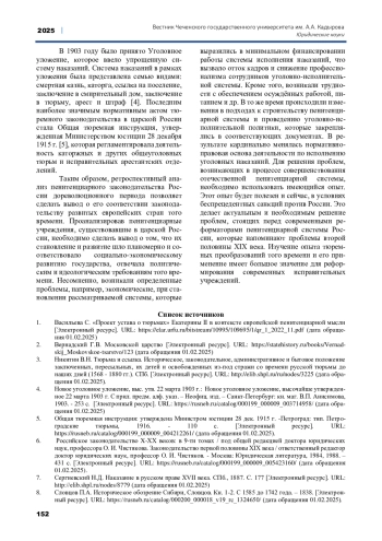 Статья: ПЕНИТЕНЦИАРНАЯ СИСТЕМА ЦАРСКОЙ РОССИИ КАК ПРЕДПОСЫЛКА СТАНОВЛЕНИЯ СОВРЕМЕННОЙ УГОЛОВНО-ИСПОЛНИТЕЛЬНОЙ СИСТЕМЫ РОССИЙСКОЙ ФЕДЕРАЦИИ: РЕТРОСПЕКТИВНЫЙ АНАЛИЗ (2025)