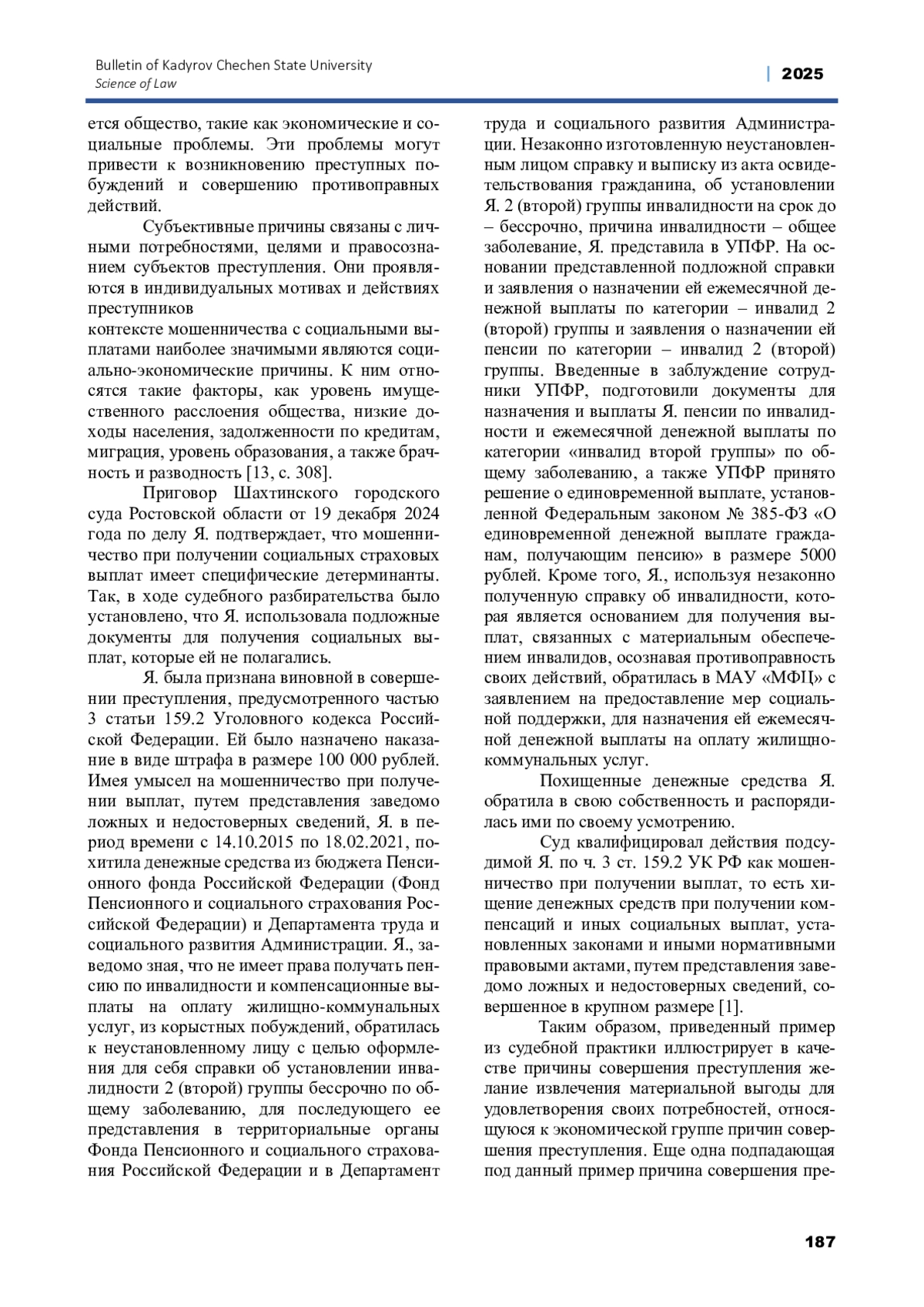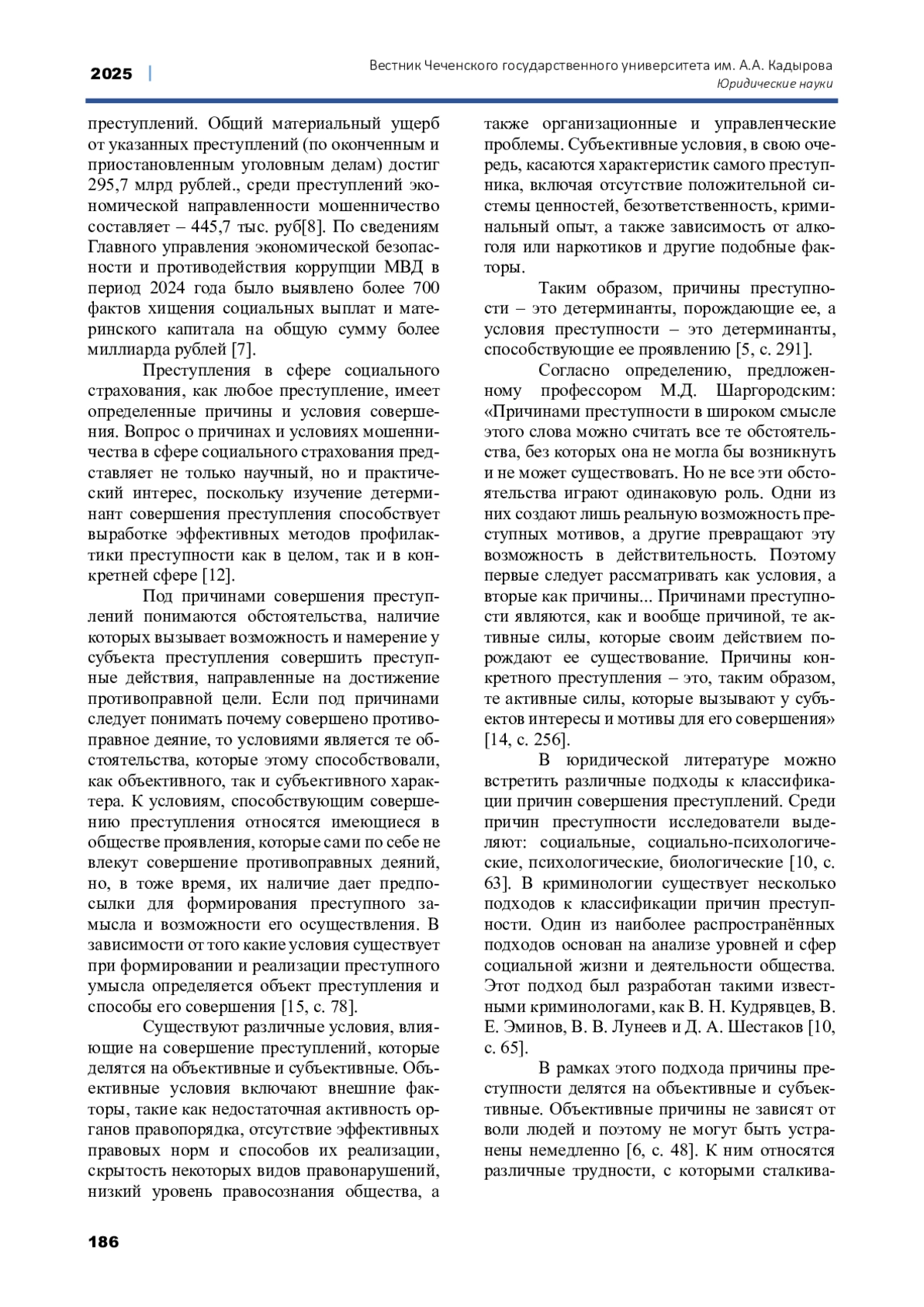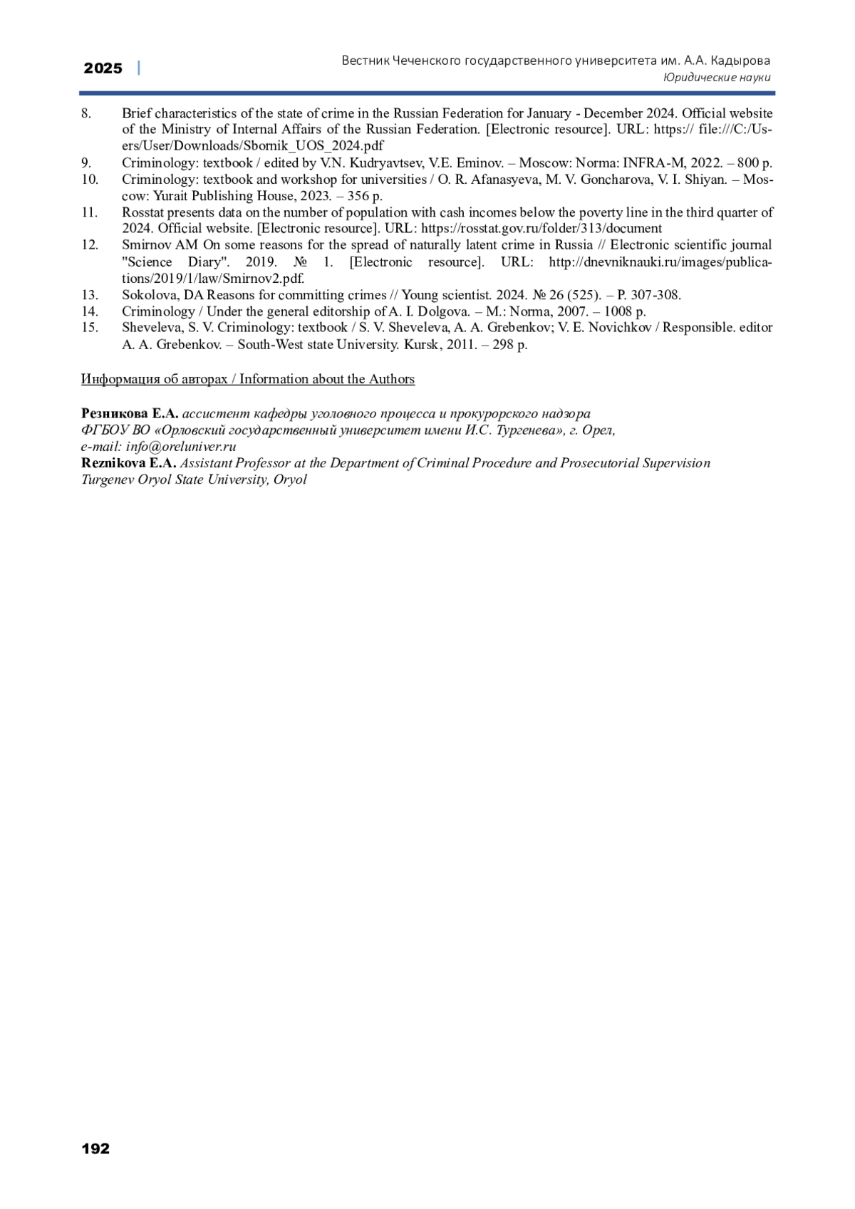 13. Соколова, Д. А. Причины совершения преступлений // Молодой ученый. 2024. № 26 (525). - С. 307-308. EDN: WAVOML