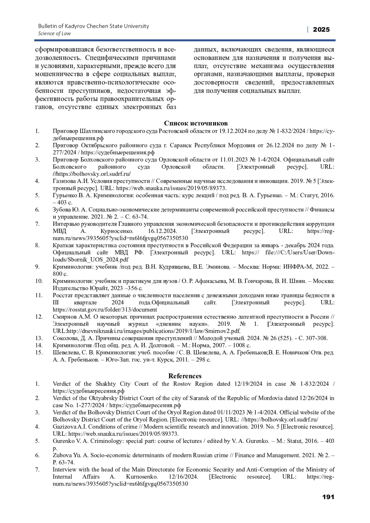 6. Зубова Ю. А. Социально-экономические детерминанты современной российской преступности // Финансы и управление. 2021. № 2. - С. 63-74.