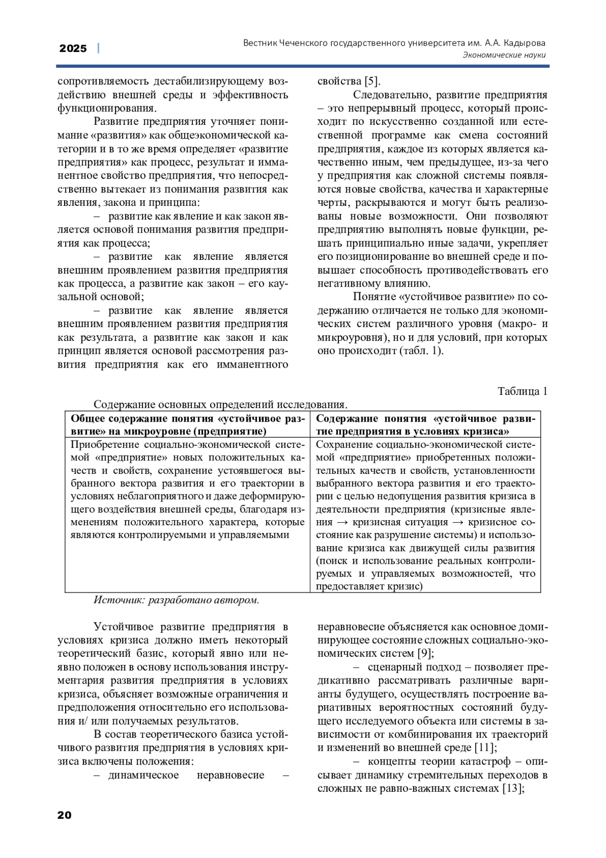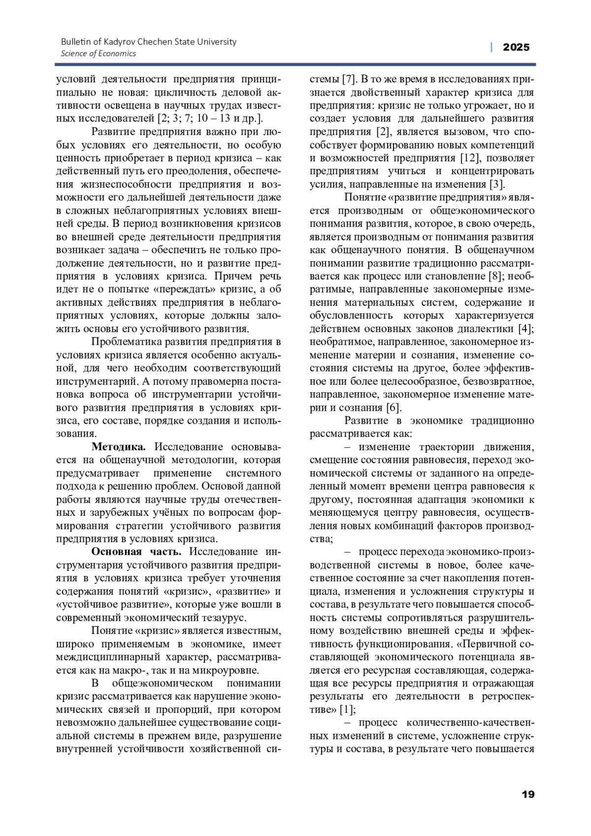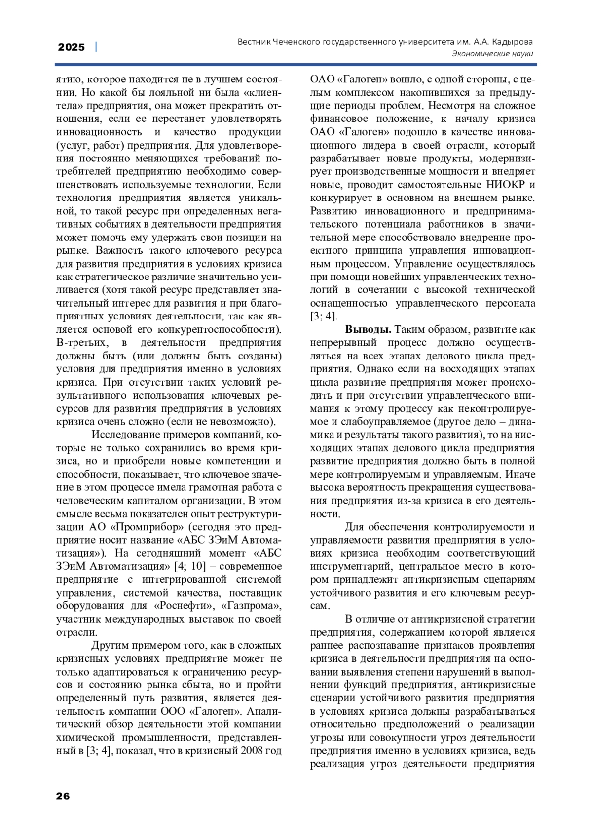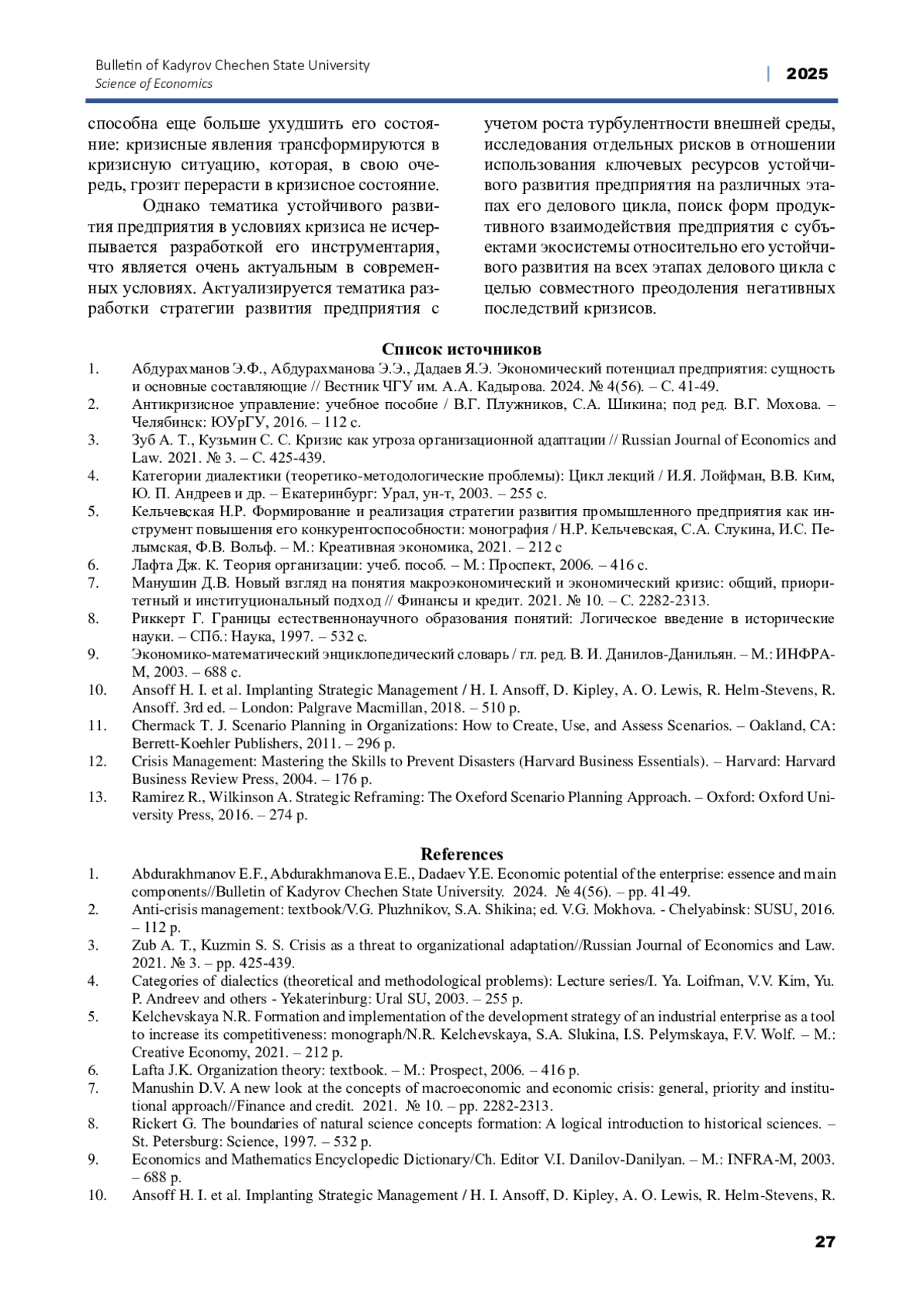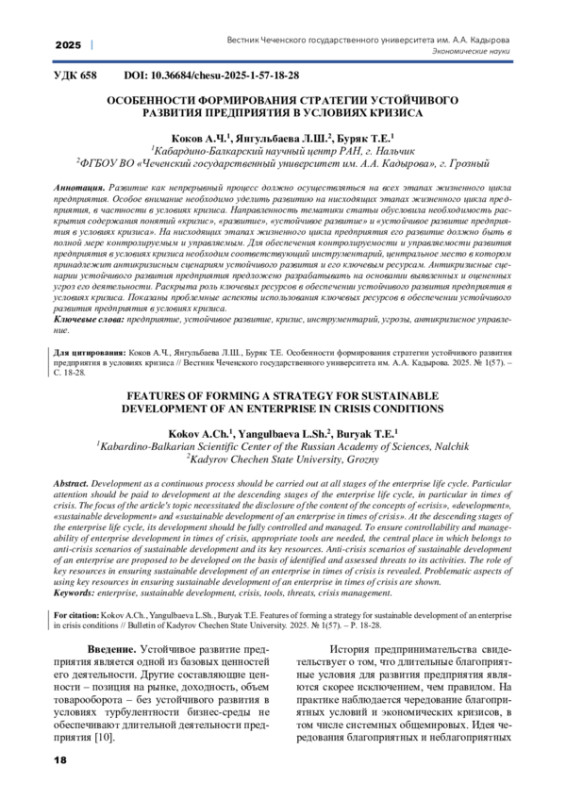 Развитие как непрерывный процесс должно осуществляться на всех этапах жизненного цикла предприятия. Особое внимание необходимо уделить развитию на нисходящих этапах жизненного цикла предприятия, в частности в условиях кризиса. Направленность тематики статьи обусловила необходимость раскрытия содержания понятий «кризис», «развитие», «устойчивое развитие» и «устойчивое развитие предприятия в условиях кризиса». На нисходящих этапах жизненного цикла предприятия его развитие должно быть в полной мере контролируемым и управляемым. Для обеспечения контролируемости и управляемости развития предприятия в условиях кризиса необходим соответствующий инструментарий, центральное место в котором принадлежит антикризисным сценариям устойчивого развития и его ключевым ресурсам. Антикризисные сценарии устойчивого развития предприятия предложено разрабатывать на основании выявленных и оцененных угроз его деятельности. Раскрыта роль ключевых ресурсов в обеспечении устойчивого развития предприятия в условиях кризиса. Показаны проблемные аспекты использования ключевых ресурсов в обеспечении устойчивого развития предприятия в условиях кризиса.