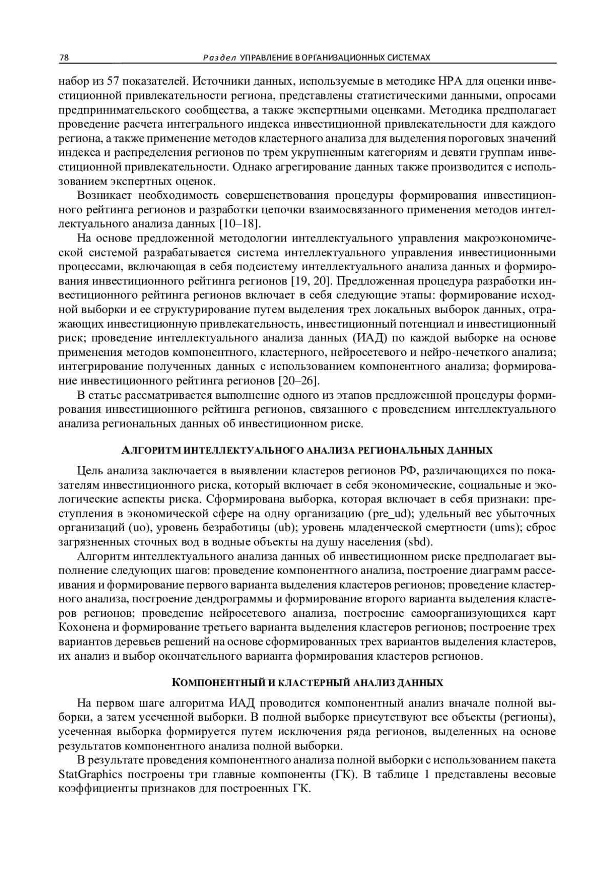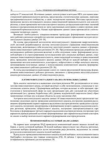 Ключевые фразы: инвестиционный риск, ИНТЕЛЛЕКТУАЛЬНЫЙ АНАЛИЗ ДАННЫХ, компонентный анализ, нейронные сети кохонена, кластер, деревья решений