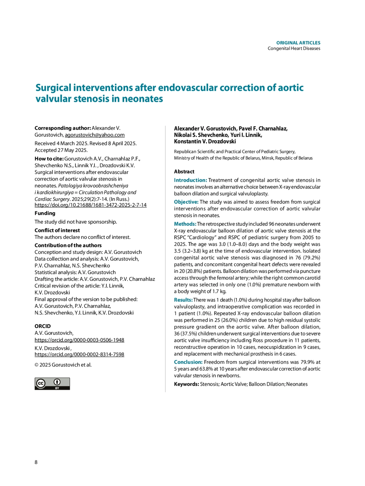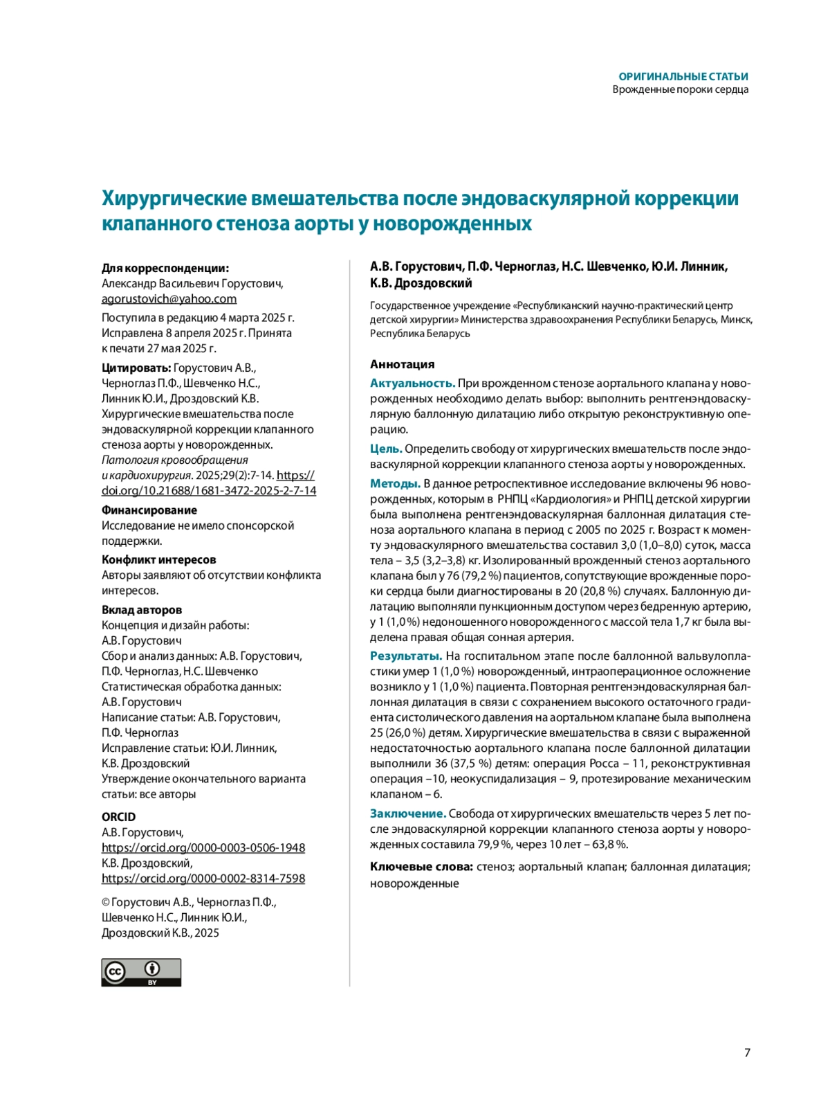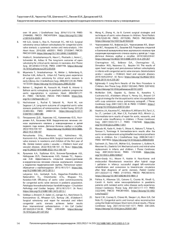 ГОРУСТОВИЧ А. В., ЧЕРНОГЛАЗ П.Ф., ШЕВЧЕНКО Н.С., ЛИННИК Ю.И., ДРОЗДОВСКИЙ К. В. ХИРУРГИЧЕСКИЕ ВМЕШАТЕЛЬСТВА ПОСЛЕ ЭНДОВАСКУЛЯРНОЙ КОРРЕКЦИИ КЛАПАННОГО СТЕНОЗА АОРТЫ У НОВОРОЖДЕННЫХ // ПАТОЛОГИЯ КРОВООБРАЩЕНИЯ И КАРДИОХИРУРГИЯ. 2025. № 2, ТОМ 29