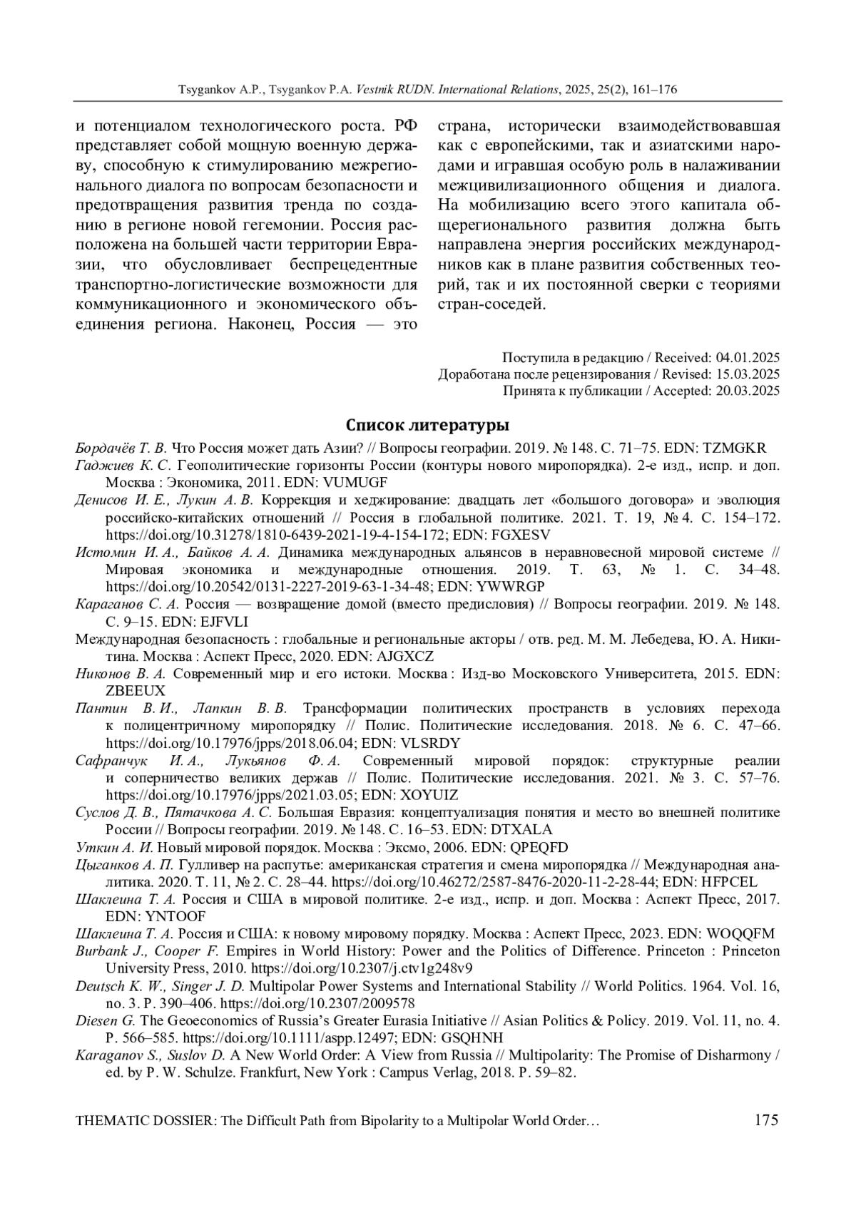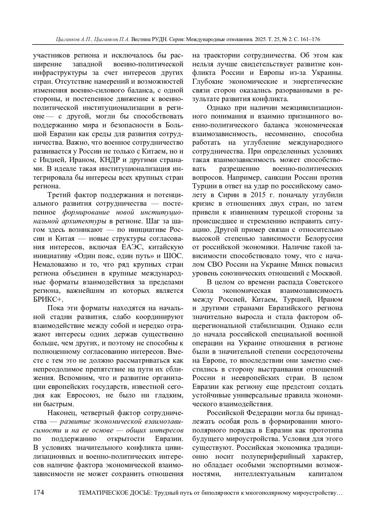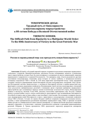 Для цитирования: Богатуров А. Д. Рецензия на книгу: Цыганков А. П., Цыганков П. А. Глобальность и самобытность. Русская идея и международная теория в XXI веке. Москва: Проспект, 2024. 280 с. // Вестник Российского университета дружбы народов. Серия: Международные отношения. 2025. Т. 25, № 2. С. 322–325. https://doi. org/10.22363/2313-0660-2025-25-2-322-325