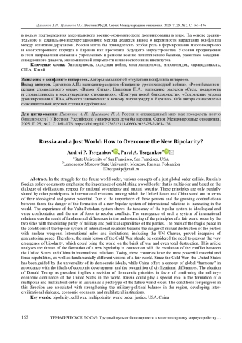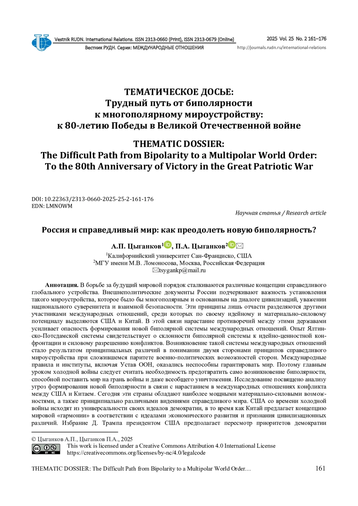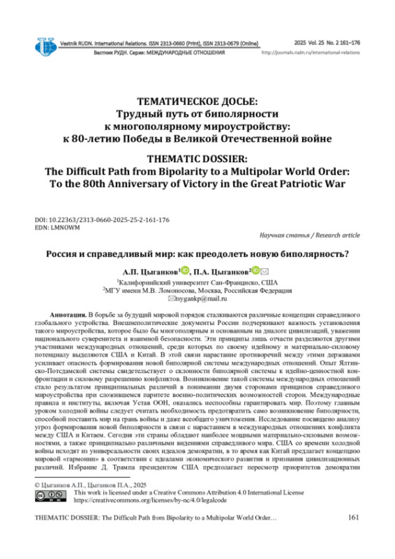 В борьбе за будущий мировой порядок сталкиваются различные концепции справедливого глобального устройства. Внешнеполитические документы России подчеркивают важность установления такого мироустройства, которое было бы многополярным и основанным на диалоге цивилизаций, уважении национального суверенитета и взаимной безопасности. Эти принципы лишь отчасти разделяются другими участниками международных отношений, среди которых по своему идейному и материально-силовому потенциалу выделяются США и Китай. В этой связи нарастание противоречий между этими державами усиливает опасность формирования новой биполярной системы международных отношений. Опыт Ялтинско-Потсдамской системы свидетельствует о склонности биполярной системы к идейно-ценностной конфронтации и силовому разрешению конфликтов. Возникновение такой системы международных отношений стало результатом принципиальных различий в понимании двумя сторонами принципов справедливого мироустройства при сложившемся паритете военно-политических возможностей сторон. Международные правила и институты, включая Устав ООН, оказались неспособны гарантировать мир. Поэтому главным уроком холодной войны следует считать необходимость предотвратить само возникновение биполярности, способной поставить мир на грань войны и даже всеобщего уничтожения. Исследование посвящено анализу угроз формирования новой биполярности в связи с нарастанием в международных отношениях конфликта между США и Китаем. Сегодня эти страны обладают наиболее мощными материально-силовыми возможностями, а также принципиально различными видениями справедливого мира. США со времени холодной войны исходят из универсальности своих идеалов демократии, в то время как Китай предлагает концепцию мировой «гармонии» в соответствии с идеалами экономического развития и признания цивилизационных различий. Избрание Д. Трампа президентом США предполагает пересмотр приоритетов демократии в пользу подтверждения американского военно-экономического доминирования в мире. На основе сравнительного и социально-интерпретационного метода делается вывод о вероятности нарастания конфликта между великими державами. России могла бы принадлежать особая роль в формировании многополярного и многостороннего порядка в Евразии как прототипа будущего мироустройства. Условия продвижения в этом направлении связаны с укреплением в регионе военно-политического баланса, развитием межцивилизационного диалога, экономической открытости и многосторонних институтов.