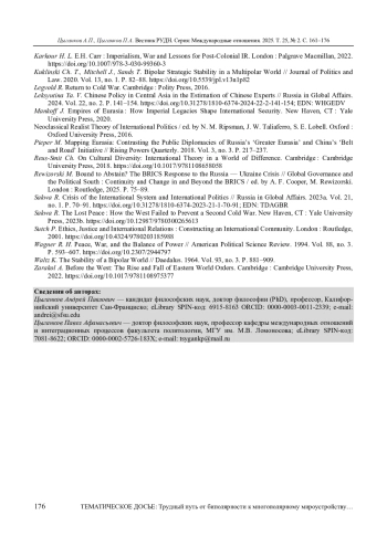 20. Kuklinski Ch. T., Mitchell J., Sands T. Bipolar Strategic Stability in a Multipolar World // Journal of Politics and Law. 2020. Vol. 13, no. 1. Р. 82-88. DOI: 10.5539/jpl.v13n1p82 EDN: MPFESB