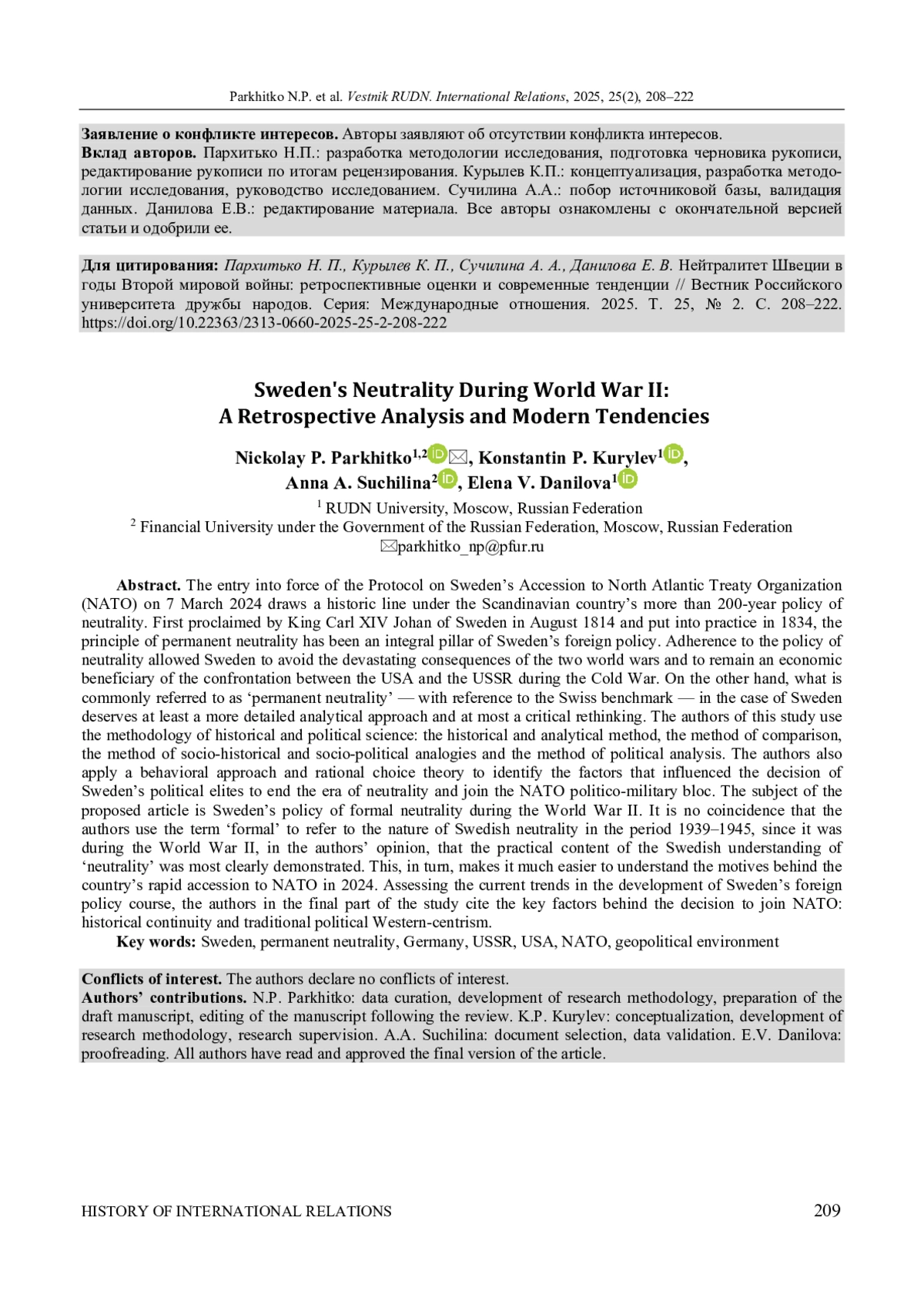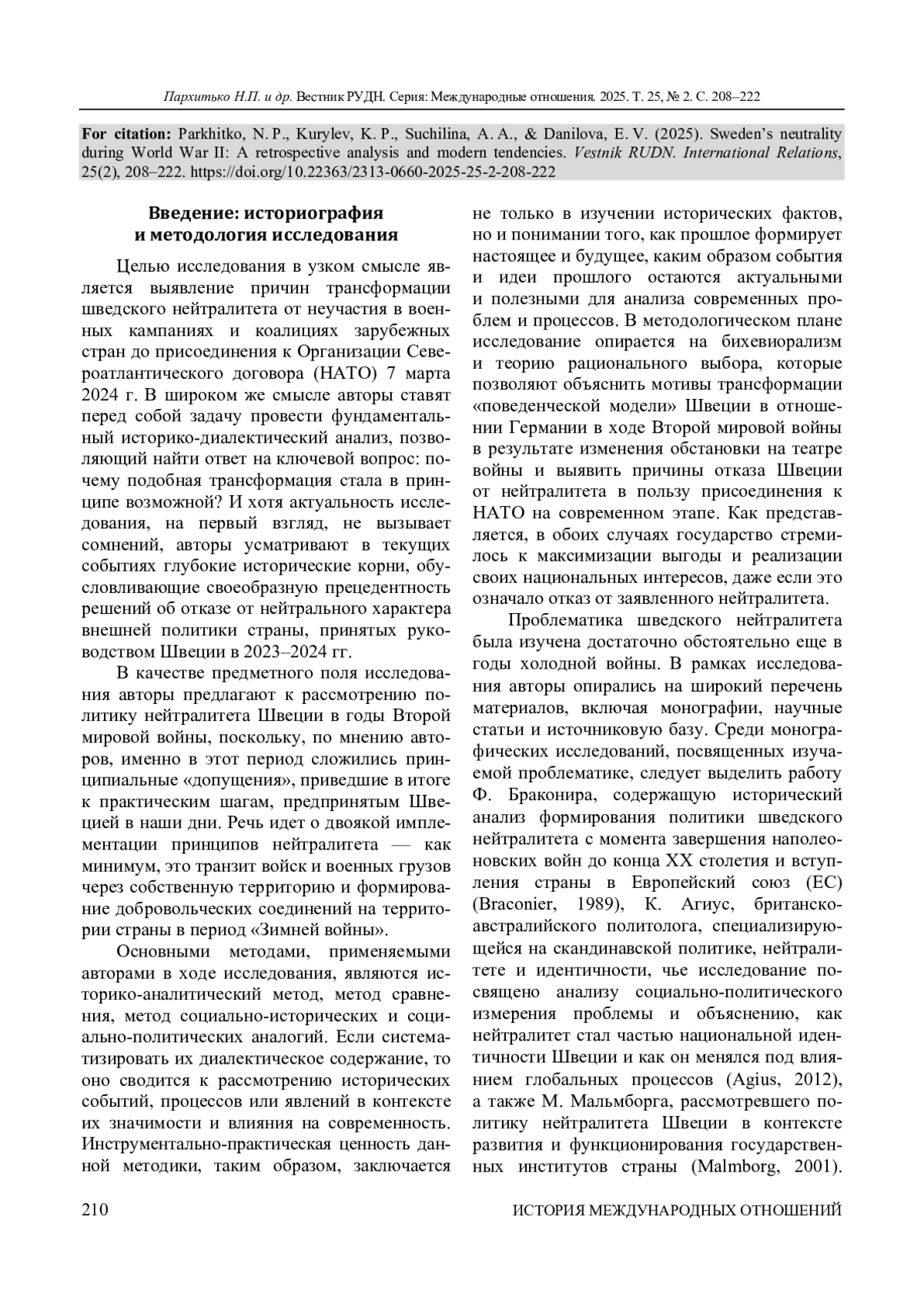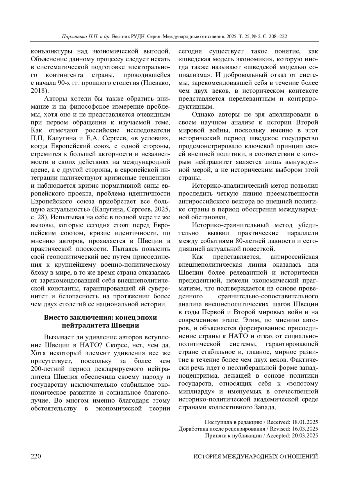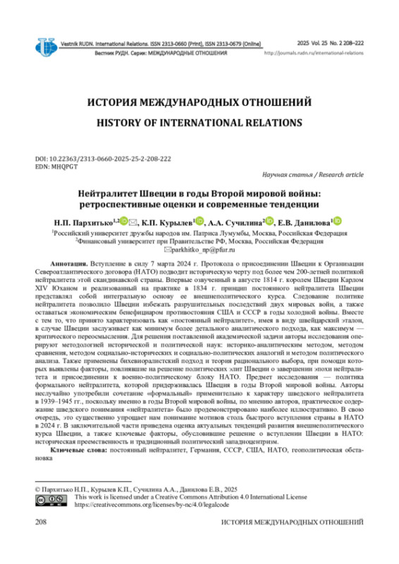 Вступление в силу 7 марта 2024 г. Протокола о присоединении Швеции к Организации Североатлантического договора (НАТО) подводит историческую черту под более чем 200-летней политикой нейтралитета этой скандинавской страны. Впервые озвученный в августе 1814 г. королем Швеции Карлом XIV Юханом и реализованный на практике в 1834 г. принцип постоянного нейтралитета Швеции представлял собой интегральную основу ее внешнеполитического курса. Следование политике нейтралитета позволило Швеции избежать разрушительных последствий двух мировых войн, а также оставаться экономическим бенефициаром противостояния США и СССР в годы холодной войны. Вместе с тем то, что принято характеризовать как «постоянный нейтралитет», имея в виду швейцарский эталон, в случае Швеции заслуживает как минимум более детального аналитического подхода, как максимум - критического переосмысления. Для решения поставленной академической задачи авторы исследования оперируют методологией исторической и политической наук: историко-аналитическим методом, методом сравнения, методом социально-исторических и социально-политических аналогий и методом политического анализа. Также применены бихевиоралистский подход и теория рационального выбора, при помощи которых выявлены факторы, повлиявшие на решение политических элит Швеции о завершении эпохи нейтралитета и присоединении к военно-политическому блоку НАТО. Предмет исследования - политика формального нейтралитета, которой придерживалась Швеция в годы Второй мировой войны. Авторы неслучайно употребили сочетание «формальный» применительно к характеру шведского нейтралитета в 1939-1945 гг., поскольку именно в годы Второй мировой войны, по мнению авторов, практическое содержание шведского понимания «нейтралитета» было продемонстрировано наиболее иллюстративно. В свою очередь, это существенно упрощает нам понимание мотивов столь быстрого вступления страны в НАТО в 2024 г. В заключительной части приведена оценка актуальных тенденций развития внешнеполитического курса Швеции, а также ключевые факторы, обусловившие решение о вступлении Швеции в НАТО: историческая преемственность и традиционный политический западноцентризм.