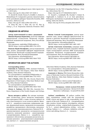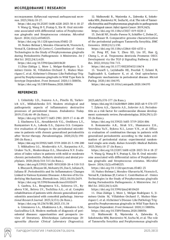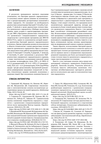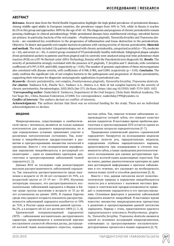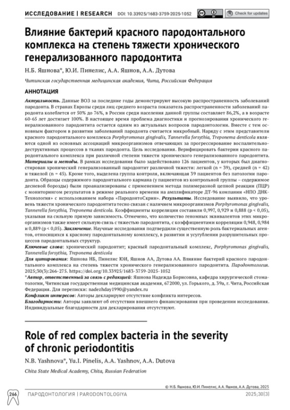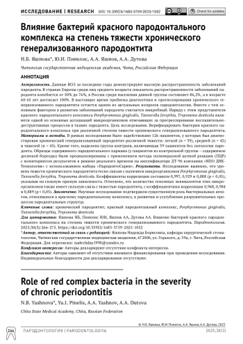 ЯШНОВА Н. Б., ПИНЕЛИС Ю. И., ЯШНОВ А. А., ДУТОВА А. А. ВЛИЯНИЕ БАКТЕРИЙ КРАСНОГО ПАРОДОНТАЛЬНОГО КОМПЛЕКСА НА СТЕПЕНЬ ТЯЖЕСТИ ХРОНИЧЕСКОГО ГЕНЕРАЛИЗОВАННОГО ПАРОДОНТИТА // ПАРОДОНТОЛОГИЯ. 2025. № 3, ТОМ 30