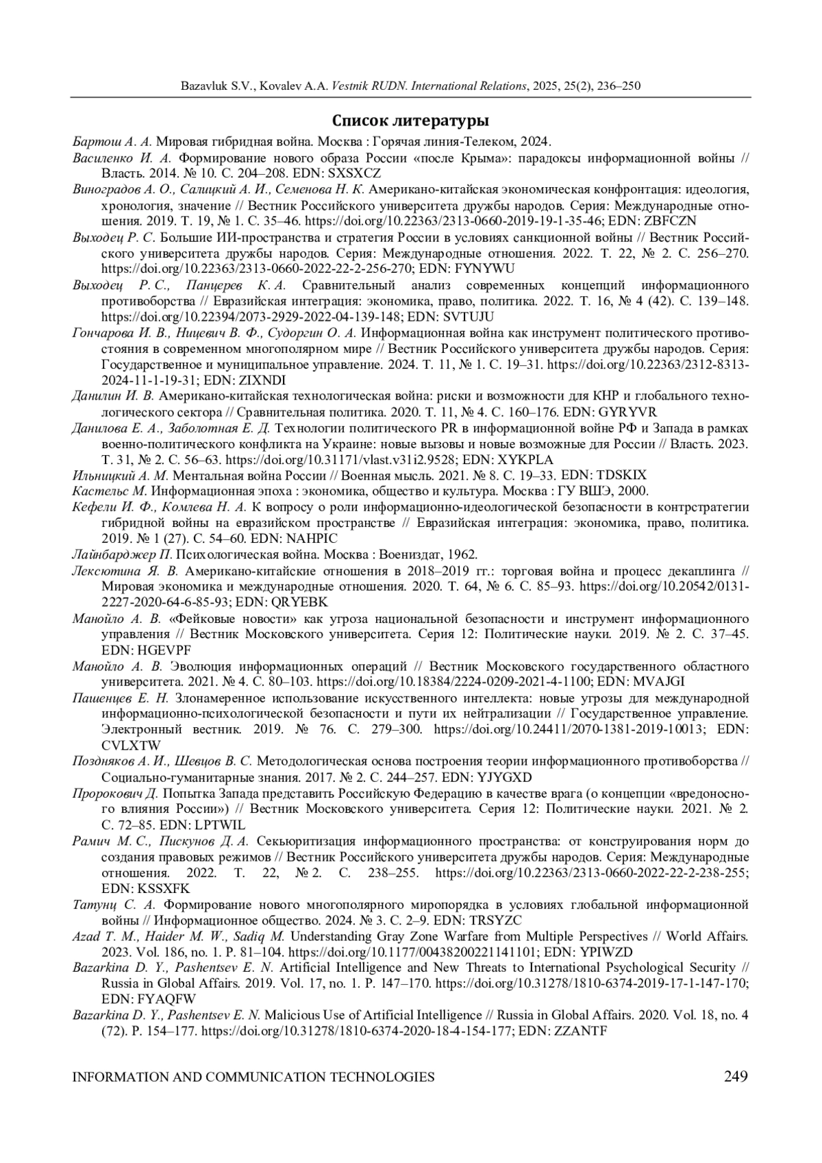 6. Гончарова И. В., Ницевич В. Ф., Судоргин О. А. Информационная война как инструмент политического противостояния в современном многополярном мире // Вестник Российского университета дружбы народов. Серия: Государственное и муниципальное управление. 2024. Т. 11, № 1. С. 19-31. ;. DOI: 10.22363/2312-8313-2024-11-1-19-31 EDN: ZIXNDI