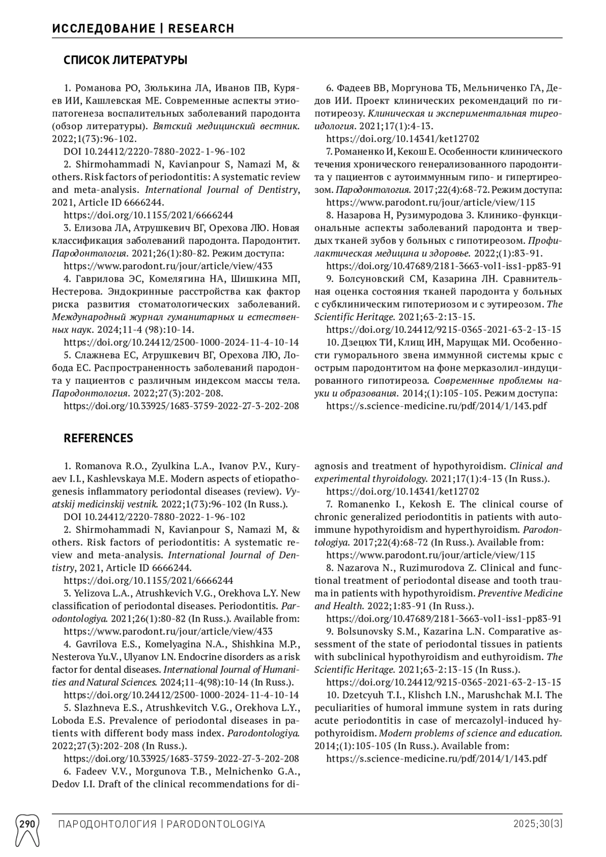 БУЛГАКОВА А. И., АМИНЕВА А. С., ВАСИЛЬЕВА Н. А., МИРСАЕВА Ф. З., ДАВЫДОВА С. В., ЗАРИПОВА А. И. ОЦЕНКА ЭФФЕКТИВНОСТИ УСОВЕРШЕНСТВОВАННОГО АЛГОРИТМА ЛЕЧЕНИЯ ВОСПАЛИТЕЛЬНЫХ ЗАБОЛЕВАНИЙ ПАРОДОНТА У ПАЦИЕНТОВ С ГИПОТИРЕОЗОМ // ПАРОДОНТОЛОГИЯ. 2025. № 3, ТОМ 30