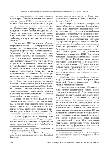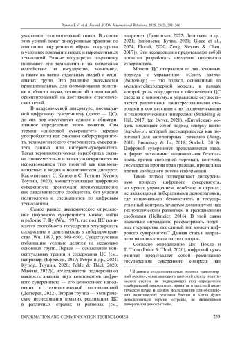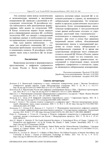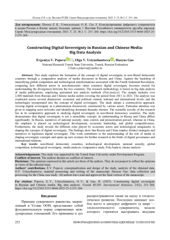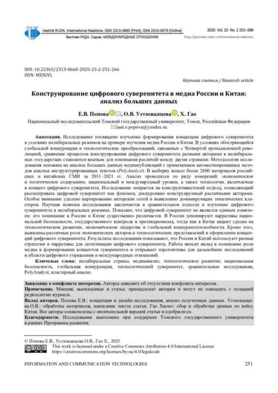Исследование посвящено изучению формирования концепции цифрового суверенитета в условиях нелиберальных режимов на примере изучения медиа России и Китая. В условиях обостряющейся глобальной конкуренции и технологических преобразований, связанных с Четвертой промышленной революцией, сравнение процессов конструирования цифрового суверенитета разными акторами в нелиберальных государствах становится важным для понимания различий между двумя странами. Методология исследования основана на анализе больших данных медиапубликаций с применением автоматизированных методов анализа неструктурированных текстов ( PolyAnalyst ). В выборку вошло более 2800 материалов российских и китайских СМИ за 2011-2021 гг. Анализ проводился по ряду измерений: экономическое и политическое содержание, национальный и международный уровни, а также технологии, включаемые в концепт цифрового суверенитета. Исследование опирается на конструктивистский подход, позволяющий рассматривать цифровой суверенитет как феномен, дискурсивно конструируемый различными акторами. Особое внимание уделено картированию акторских сетей и выявлению доминирующих тематических кластеров. Научная новизна исследования заключается в сравнительном подходе к изучению цифрового суверенитета в нелиберальных режимах. Показано, что цифровой суверенитет не является единым понятием: его понимание в России и Китае существенно различается. В России доминируют нарративы национальной безопасности, государственного контроля и протекционизма, тогда как в Китае акцент сделан на технологическом развитии, экономическом лидерстве и глобальной конкурентоспособности. Кроме того, выявлены различные роли экономических акторов и технологических представлений в оформлении концепций цифрового суверенитета. Результаты исследования показывают, что Россия и Китай используют разные стратегии и нарративы для легитимации цифрового суверенитета. Работа вносит вклад в понимание роли медиа в формировании концептов суверенитета и открывает перспективы для дальнейших исследований в области цифрового управления и международных отношений.