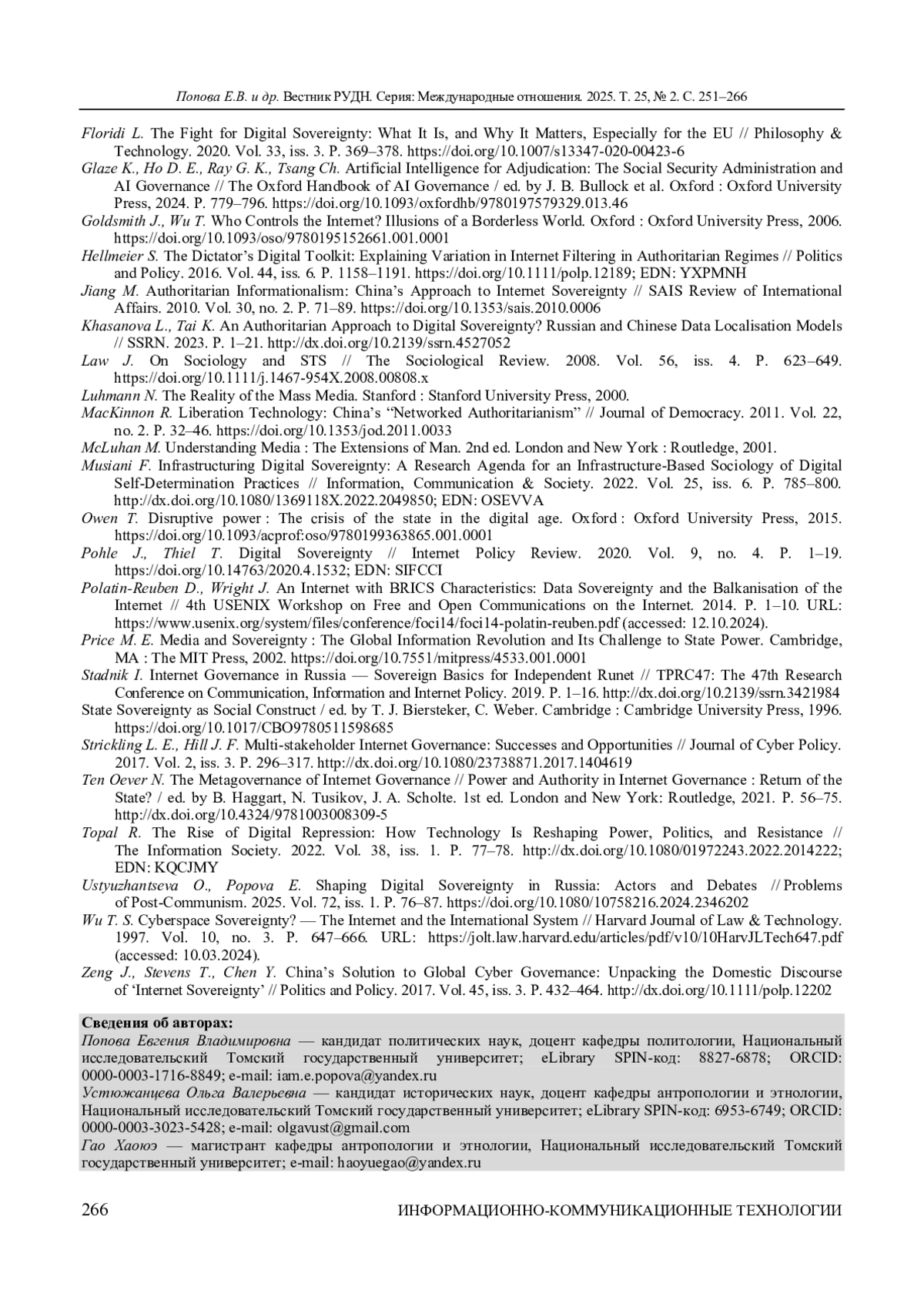 31. Ustyuzhantseva O., Popova E. Shaping Digital Sovereignty in Russia: Actors and Debates // Problems of Post-Communism. 2025. Vol. 72, iss. 1. P. 76-87. DOI: 10.1080/10758216.2024.2346202 EDN: AIUNXI