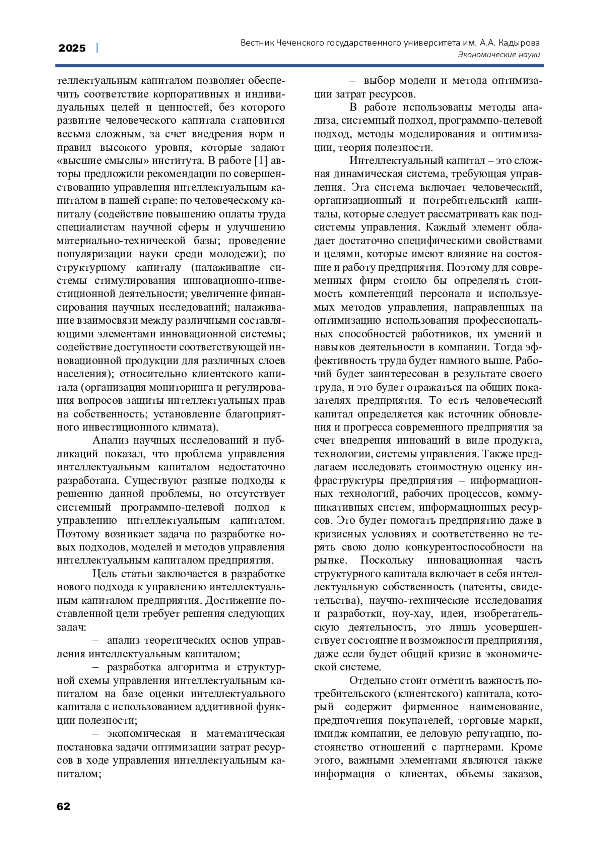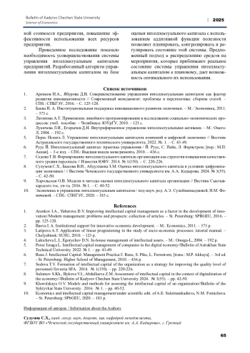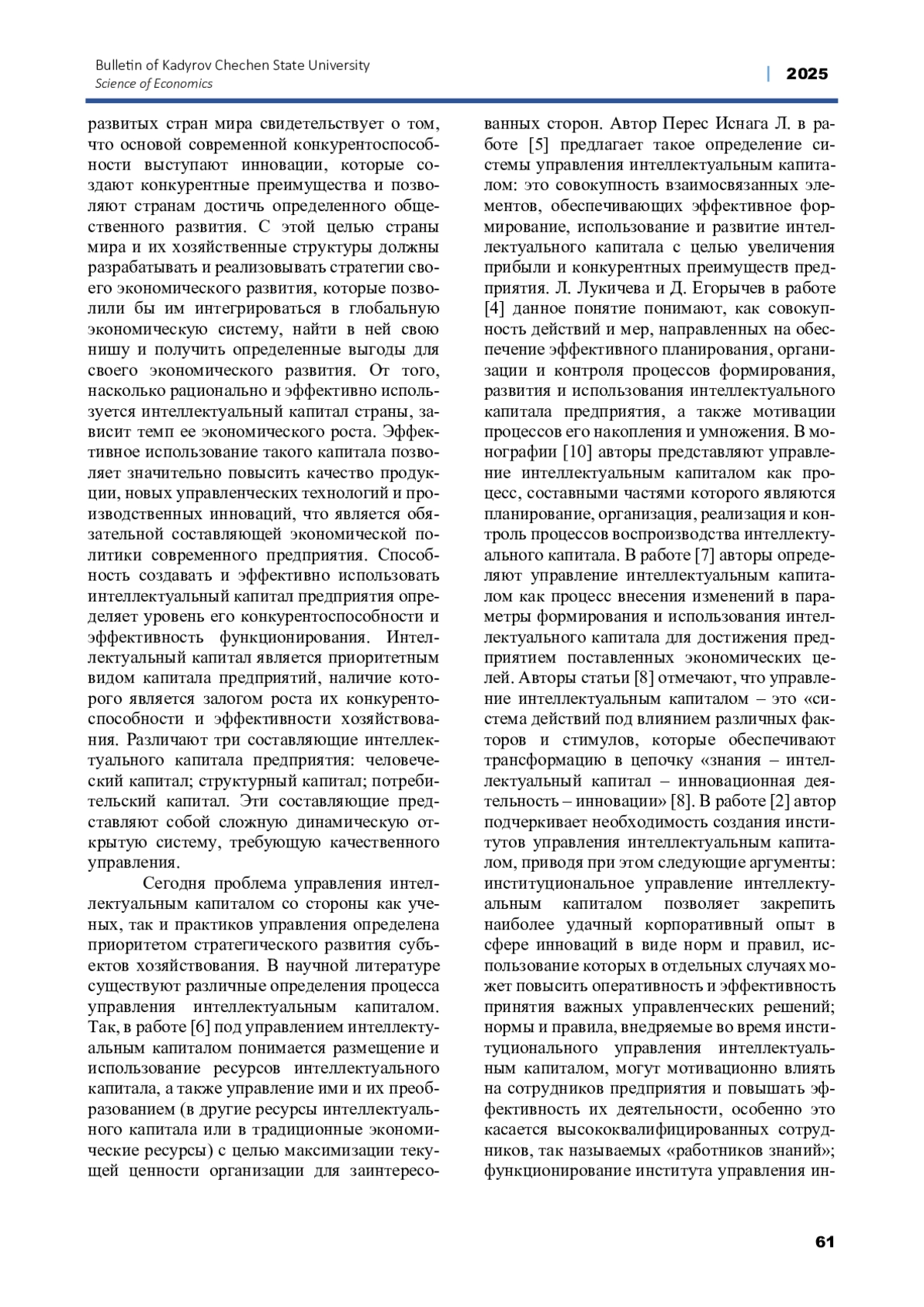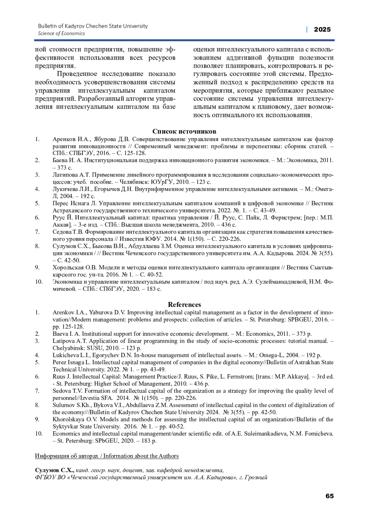 8. Сулумов С.Х., Быкова В.И., Абдуллаева З.М. Оценка интеллектуального капитала в условиях цифровизации экономики /// Вестник Чеченского государственного университета им. А.А. Кадырова. 2024. № 3(55). - С. 42-50. EDN: LFOTAR