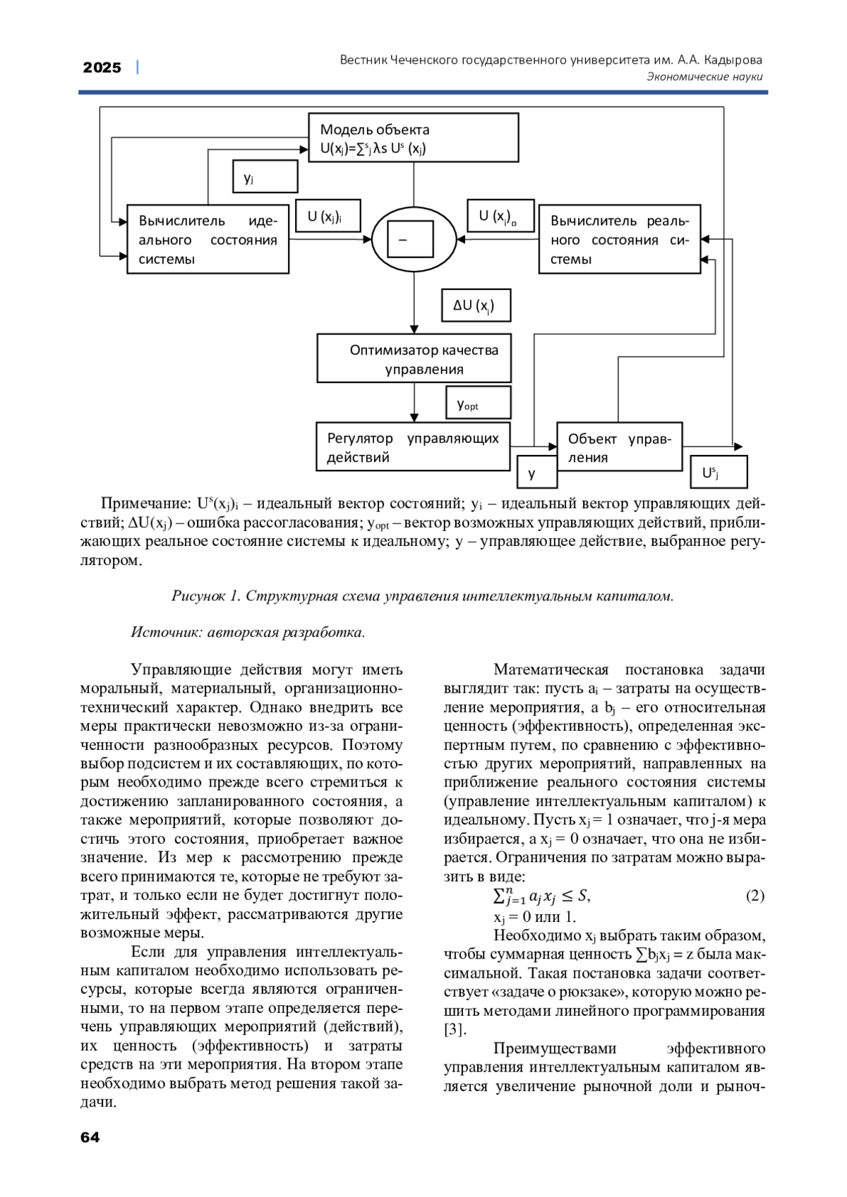 Интеллектуальный капитал является приоритетным видом капитала. Управление интеллектуальным капиталом представлено как многоуровневая динамическая открытая система. Эта система включает человеческий, организационный и потребительский капиталы, которые следует рассматривать как подсистемы управления. Для исследования интеллектуального капитала предприятия использованы системный и программно-целевой подходы. В качестве критерия оптимальности достижения цели в процессе управления интеллектуальным капиталом предлагается аддитивная функция полезности. Разработан алгоритм и структурная схема управления интеллектуальным капиталом предприятия. Разработанный алгоритм управления интеллектуальным капиталом на базе его оценки с использованием функции полезности позволяет планировать, контролировать и регулировать состояние этой системы. Для оптимизации затрат ресурсов, связанных с достижением высокой эффективности интеллектуального капитала, осуществлена постановка задачи и предложена математическая модель «задача о рюкзаке». Предложенный подход к распределению средств на мероприятия, которые приближают реальное состояние системы управления интеллектуальным капиталом к плановому, дает возможность их оптимального использования.