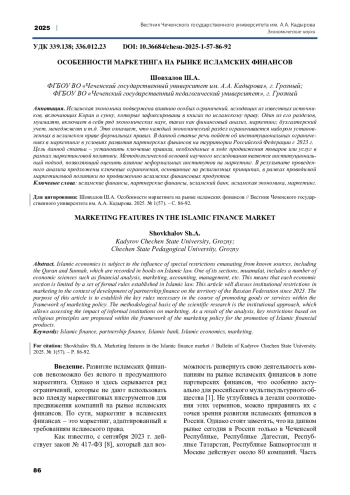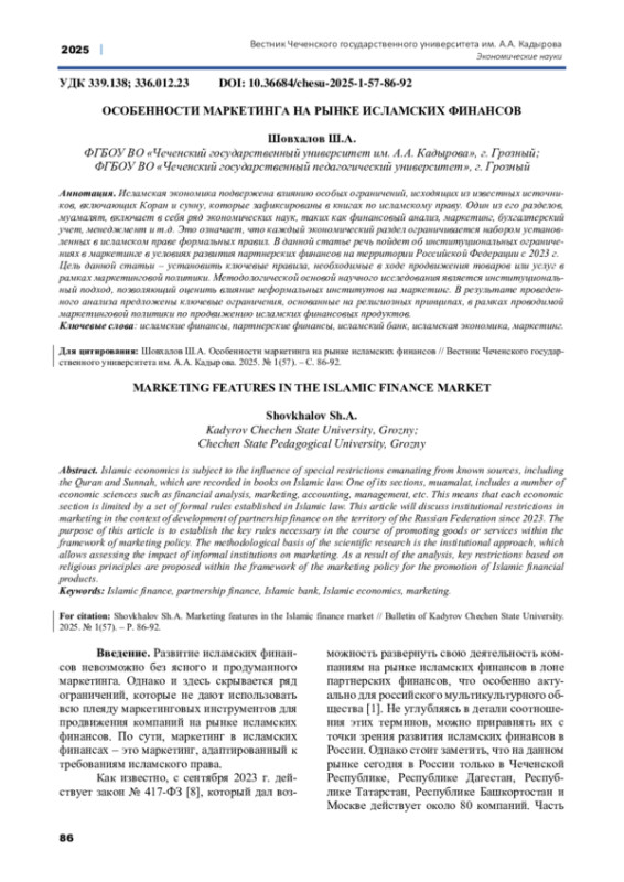 Исламская экономика подвержена влиянию особых ограничений, исходящих из известных источников, включающих Коран и сунну, которые зафиксированы в книгах по исламскому праву. Один из его разделов, муамалят, включает в себя ряд экономических наук, таких как финансовый анализ, маркетинг, бухгалтерский учет, менеджмент и т. д. Это означает, что каждый экономический раздел ограничивается набором установленных в исламском праве формальных правил. В данной статье речь пойдет об институциональных ограничениях в маркетинге в условиях развития партнерских финансов на территории Российской Федерации с 2023 г. Цель данной статьи - установить ключевые правила, необходимые в ходе продвижения товаров или услуг в рамках маркетинговой политики. Методологической основой научного исследования является институциональный подход, позволяющий оценить влияние неформальных институтов на маркетинг. В результате проведенного анализа предложены ключевые ограничения, основанные на религиозных принципах, в рамках проводимой маркетинговой политики по продвижению исламских финансовых продуктов.