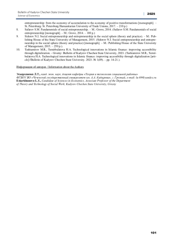 10. Таштамиров М.Р., Темирбулатова Х.А. Технологические инновации в исламских финансах: улучшение доступности посредством цифровизации// Вестник Чеченского государственного университета им. А.А. Кадырова. 2023. № 1(49). - С. 14-21.