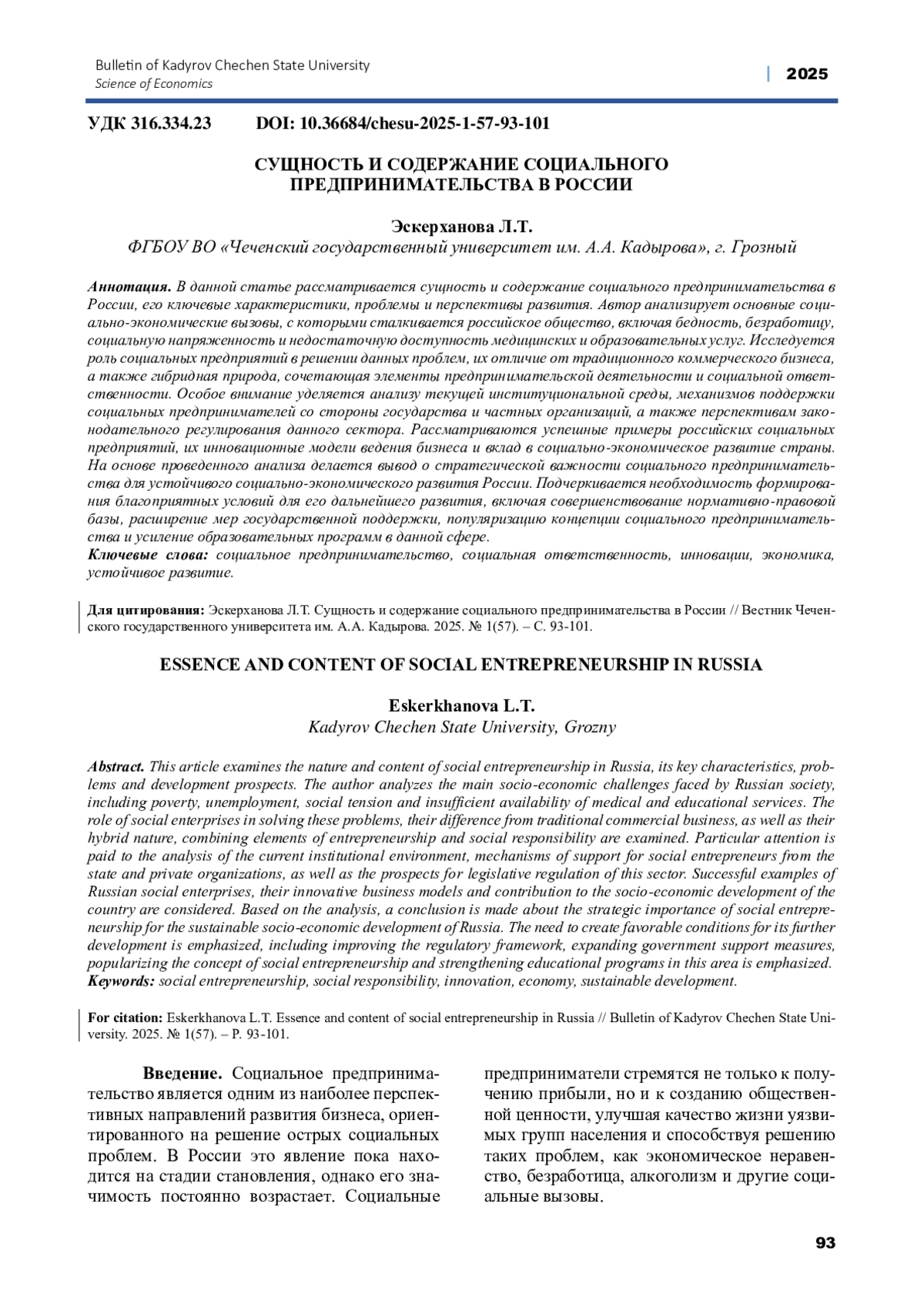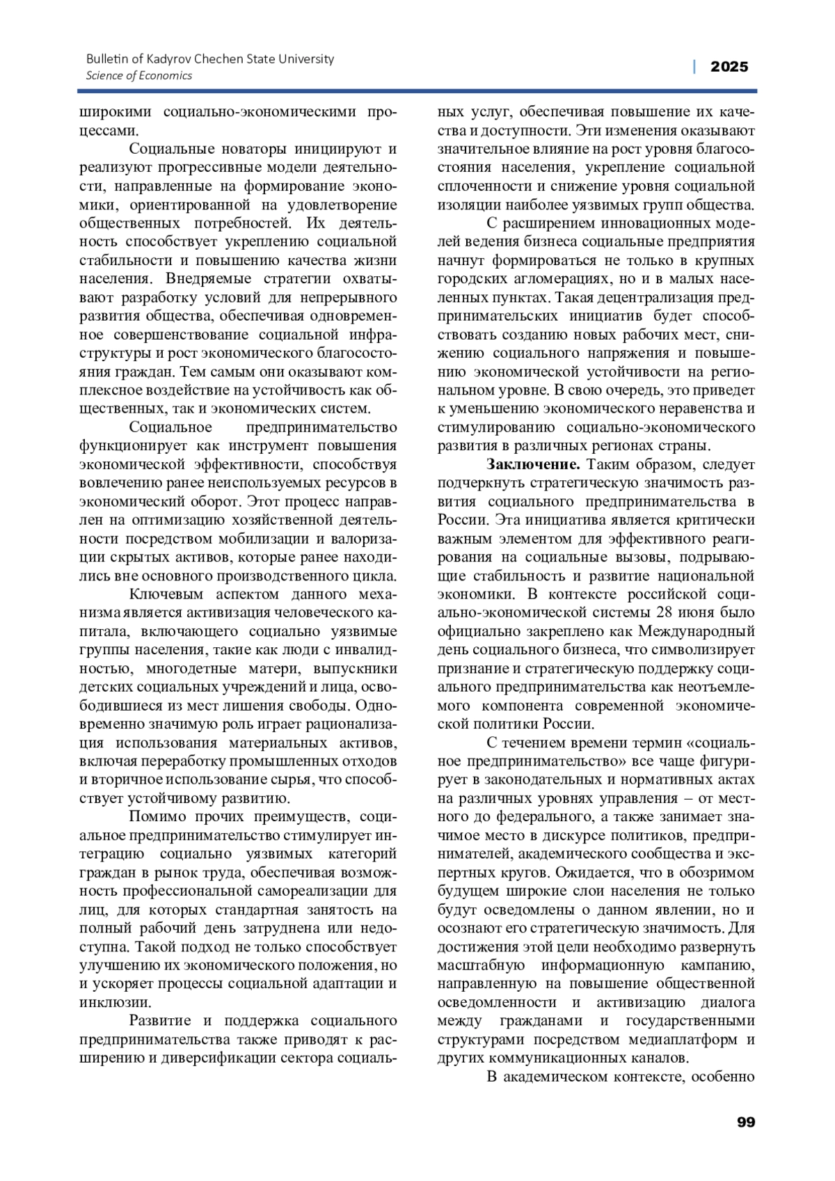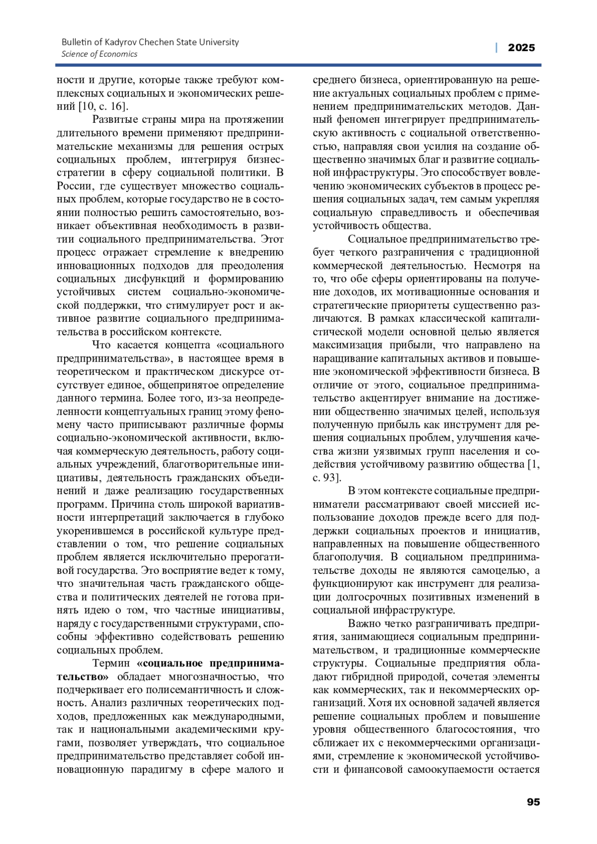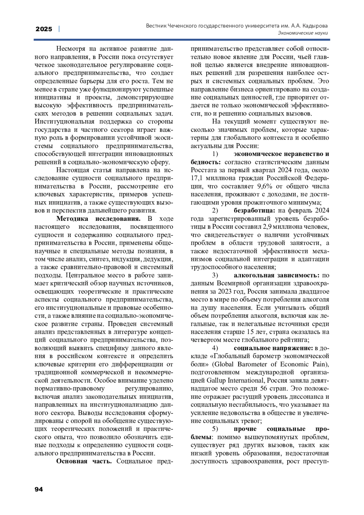В данной статье рассматривается сущность и содержание социального предпринимательства в России, его ключевые характеристики, проблемы и перспективы развития. Автор анализирует основные социально-экономические вызовы, с которыми сталкивается российское общество, включая бедность, безработицу, социальную напряженность и недостаточную доступность медицинских и образовательных услуг. Исследуется роль социальных предприятий в решении данных проблем, их отличие от традиционного коммерческого бизнеса, а также гибридная природа, сочетающая элементы предпринимательской деятельности и социальной ответственности. Особое внимание уделяется анализу текущей институциональной среды, механизмов поддержки социальных предпринимателей со стороны государства и частных организаций, а также перспективам законодательного регулирования данного сектора. Рассматриваются успешные примеры российских социальных предприятий, их инновационные модели ведения бизнеса и вклад в социально-экономическое развитие страны. На основе проведенного анализа делается вывод о стратегической важности социального предпринимательства для устойчивого социально-экономического развития России. Подчеркивается необходимость формирования благоприятных условий для его дальнейшего развития, включая совершенствование нормативно-правовой базы, расширение мер государственной поддержки, популяризацию концепции социального предпринимательства и усиление образовательных программ в данной сфере.