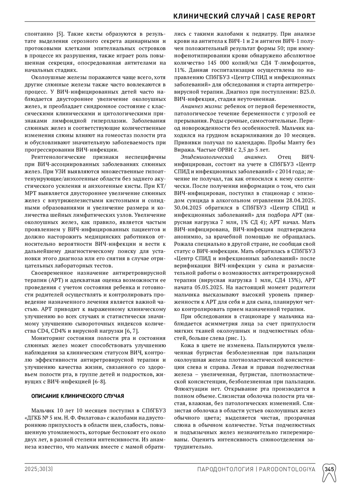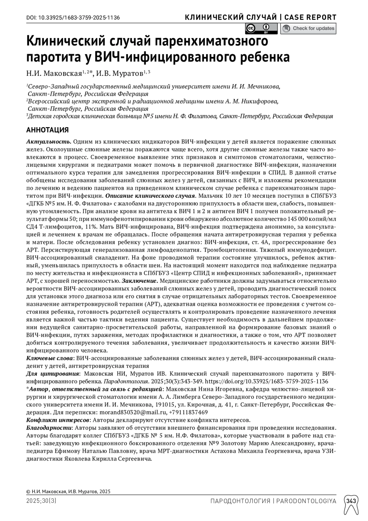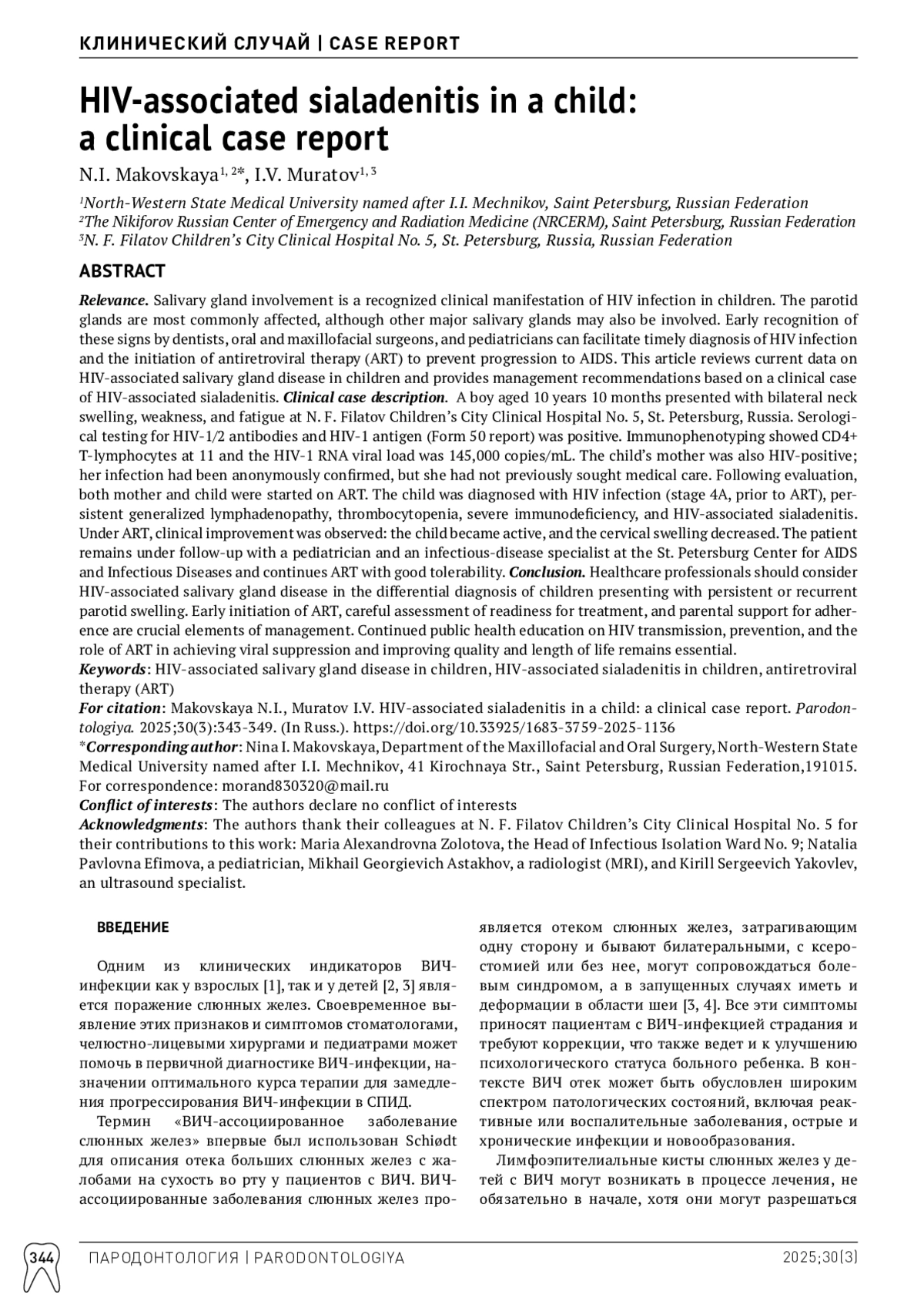 МАКОВСКАЯ Н. И., МУРАТОВ И. В. КЛИНИЧЕСКИЙ СЛУЧАЙ ПАРЕНХИМАТОЗНОГО ПАРОТИТА У ВИЧ-ИНФИЦИРОВАННОГО РЕБЕНКА // ПАРОДОНТОЛОГИЯ. 2025. № 3, ТОМ 30