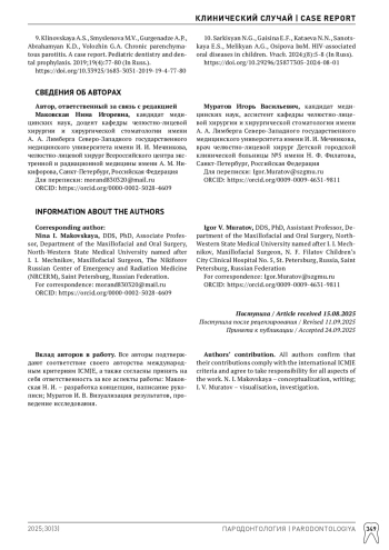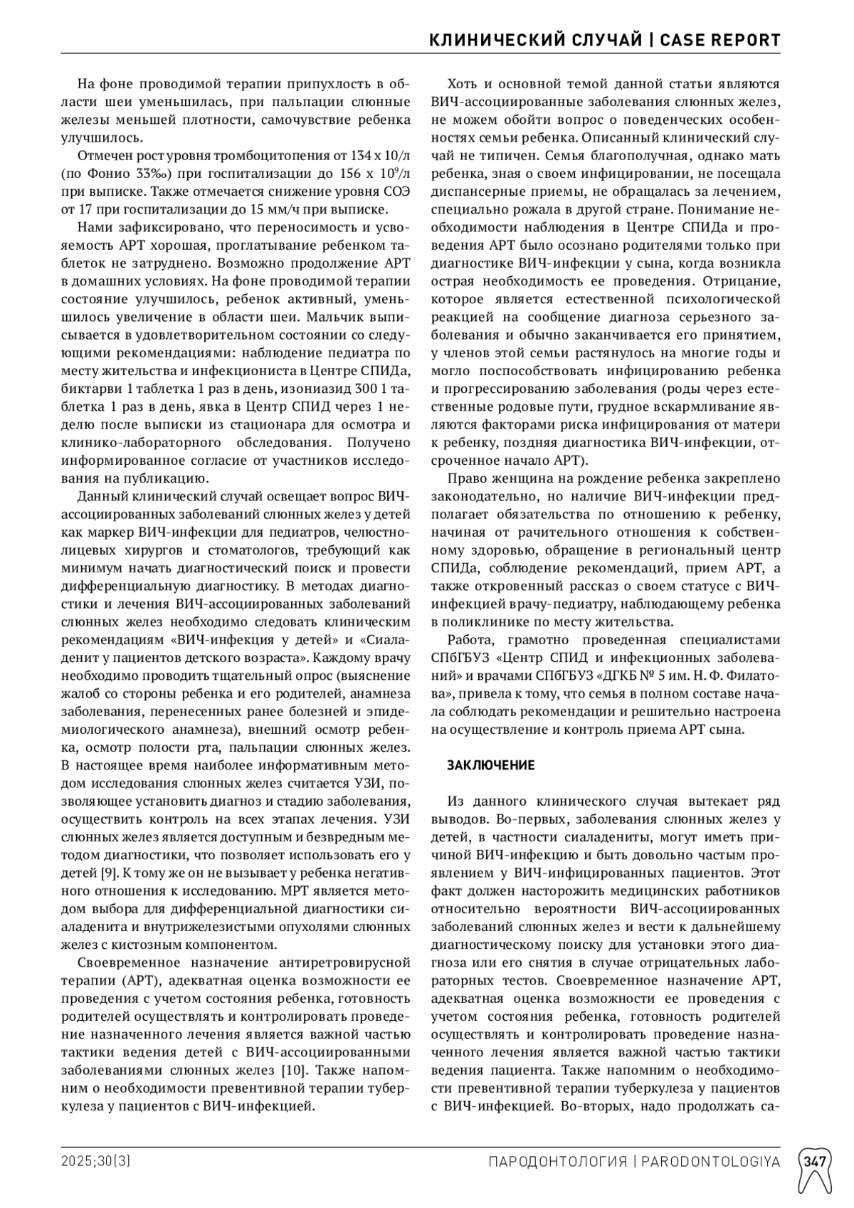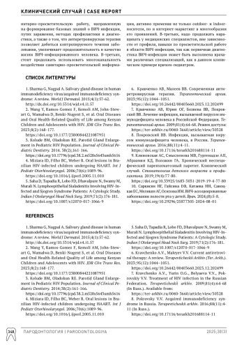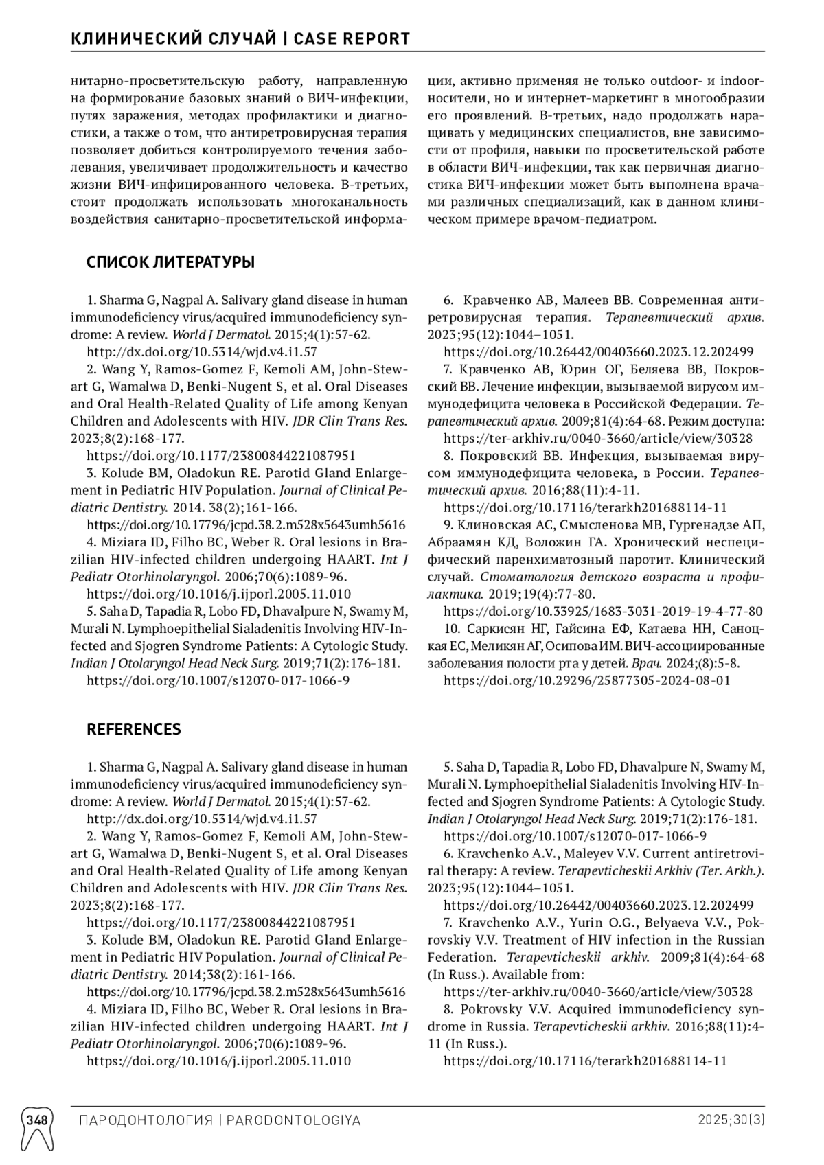 МАКОВСКАЯ Н. И., МУРАТОВ И. В. КЛИНИЧЕСКИЙ СЛУЧАЙ ПАРЕНХИМАТОЗНОГО ПАРОТИТА У ВИЧ-ИНФИЦИРОВАННОГО РЕБЕНКА // ПАРОДОНТОЛОГИЯ. 2025. № 3, ТОМ 30
