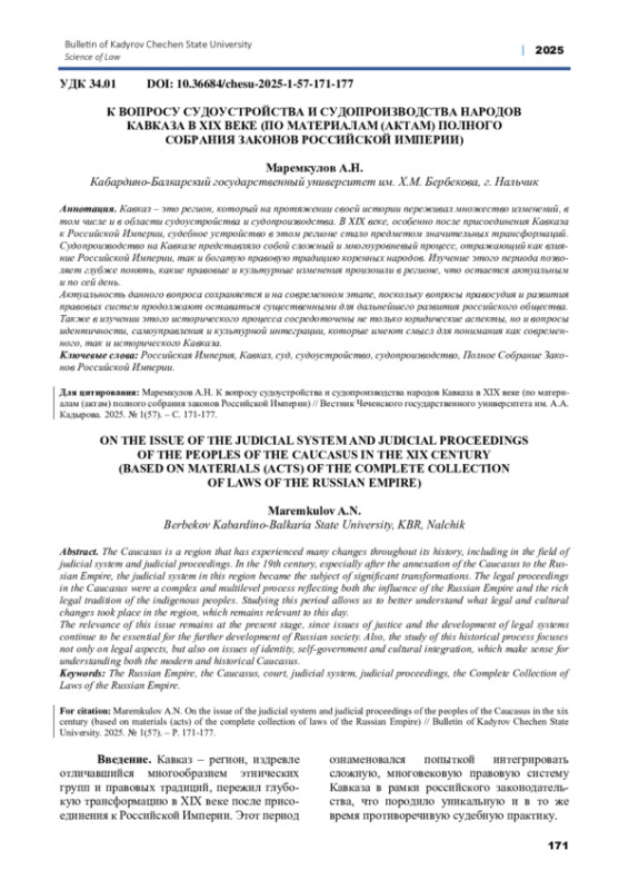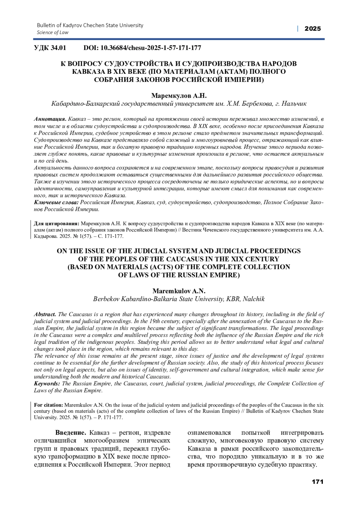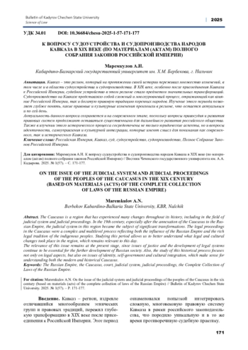 Кавказ - это регион, который на протяжении своей истории переживал множество изменений, в том числе и в области судоустройства и судопроизводства. В XIX веке, особенно после присоединения Кавказа к Российской Империи, судебное устройство в этом регионе стало предметом значительных трансформаций. Судопроизводство на Кавказе представляло собой сложный и многоуровневый процесс, отражающий как влияние Российской Империи, так и богатую правовую традицию коренных народов. Изучение этого периода позволяет глубже понять, какие правовые и культурные изменения произошли в регионе, что остается актуальным и по сей день. Актуальность данного вопроса сохраняется и на современном этапе, поскольку вопросы правосудия и развития правовых систем продолжают оставаться существенными для дальнейшего развития российского общества. Также в изучении этого исторического процесса сосредоточены не только юридические аспекты, но и вопросы идентичности, самоуправления и культурной интеграции, которые имеют смысл для понимания как современного, так и исторического Кавказа.