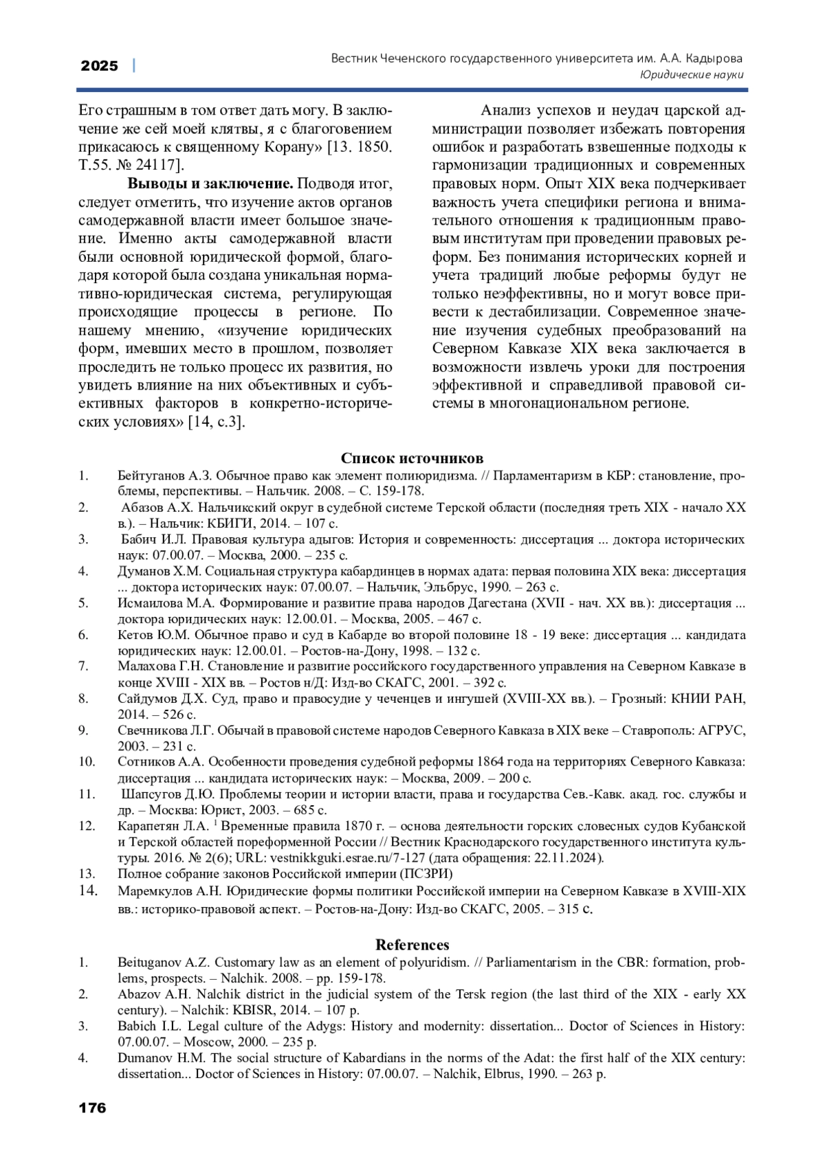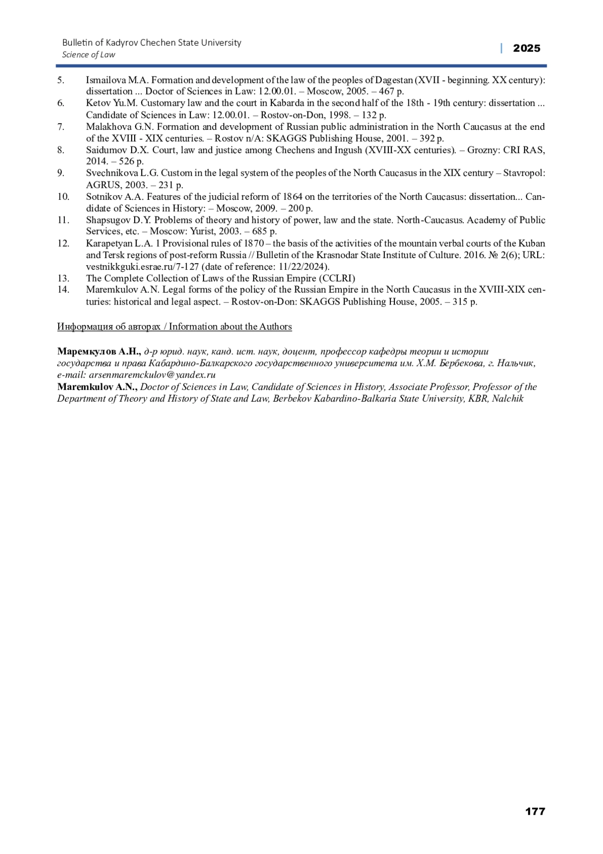 14. Маремкулов А.Н. Юридические формы политики Российской империи на Северном Кавказе в XVIII-XIX вв.: историко-правовой аспект. - Ростов-на-Дону: Изд-во СКАГС, 2005. - 315 с. EDN: QWNWVP