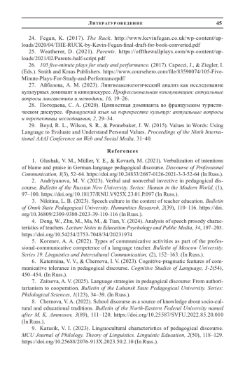 Статья посвящена актуальной проблеме лингвоаксиологического маркирования профессионального педагогического сообщества в сфере стилизованного межличностного общения. Цель исследования - выявление механизмов конструирования лингвоаксиологического портрета профессиональной группы, а именно школьных педагогов, в англоязычном драматургическом дискурсе. В качестве исследовательского инструмента была избрана дискурсивно-аксиологическая интерпретация, подразумевающая совокупное использование методов ценностно-оценочного анализа и дискурс-анализа с привлечением метода стилистического анализа коммуникативных фрагментов. По результатам исследования десяти произведений англоязычной драматургии XXI века, в которых находит отражение образ школьного учителя, представлено новое понятие «лингвоаксиологический портрет педагога как представителя профессионального сообщества», намечены принципы его дискурсивной манифестации, картографированы структурные и содержательные компоненты. Определены ключевые характеристики ценностно-оценочной парадигмы педагога, формирующие лингвоаксиологический портрет. Выявлено, что лингвоаксиологический портрет педагога представляет собой многомерный комплексный конструкт, отражающий личностную речевую специфику при выражении позитивных и негативных оценочных отношений, профессионально обусловленные ценностные доминанты, а также актуальную оценку педагога в современном лингвокультурном сообществе. Доказано, что в исследованном фрагменте драматургического дискурса наиболее ярко аспекты профессиональной лингвоаксиосферы проявляются при речевом взаимодействии педагога как с учениками, так и с родственниками учеников. Зафиксировано, что оценочные высказывания персонажей-педагогов системно транслируют следующие ценностные доминанты: мотивирование учеников, поддержку их стремлений и достижений, уверенность в их силах и способностях. Социальное мнение о педагогах имеет позитивную направленность и формируется в основном родительской общественностью, что также находит вербальное маркирование в пределах драматургического дискурсивного пространства.