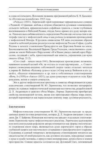 Статья посвящена исследованию отдельных стихотворений М. Ю. Лермонтова в системе мифопоэтической концепции вестничества, сформированной в трактате Д. Л. Андреева «Роза Мира» (1958). В таком контексте классические тексты Лермонтова рассматриваются как образцы визионерской лирики. На основе герменевтического метода устанавливается эстетическая роль и идейно-художественная актуальность мифопоэтических элементов образного мира Лермонтова. Обнаруживается гностическая природа понимания лирического Я, мистическая перспектива любовной поэзии, русского пейзажа, социальных мотивов. С помощью мифопоэтической интерпретации лермонтовских стихотворений «Ночь. I» (1830), «Предсказание» (1830), «Ангел» (1831), «Мой демон» (1831), «Когда волнуется желтеющая нива…» (1837), «Как часто пестрою толпою окружен…» (1840), «Из-под таинственной холодной полумаски…» (1841), «Выхожу один я на дорогу…» (1841), «Пророк» (1841), «Родина» (1841) и др. раскрываются отдельные смысловые пласты образности, связывающей поэзию Лермонтова с русским мифо-поэтическим художественным пространством, приобретающим роль пророческого гипертекста. Делается вывод о том, что в ряде стихотворений М. Ю. Лермонтова присутствуют образы и идеи, повлиявшие на формирование теории и практики русского символизма и постсимволизма в качестве образцов мифопоэтического мышления. Результаты исследования расширяют и дополняют представления о мифопоэтических параллелях и традициях в целостном художественном пространстве русской лирики, историко-литературном контексте и возможностях интерпретации классических стихотворений М. Ю. Лермонтова в системе дискуссионности и герменевтического феномена приращения смыслов.