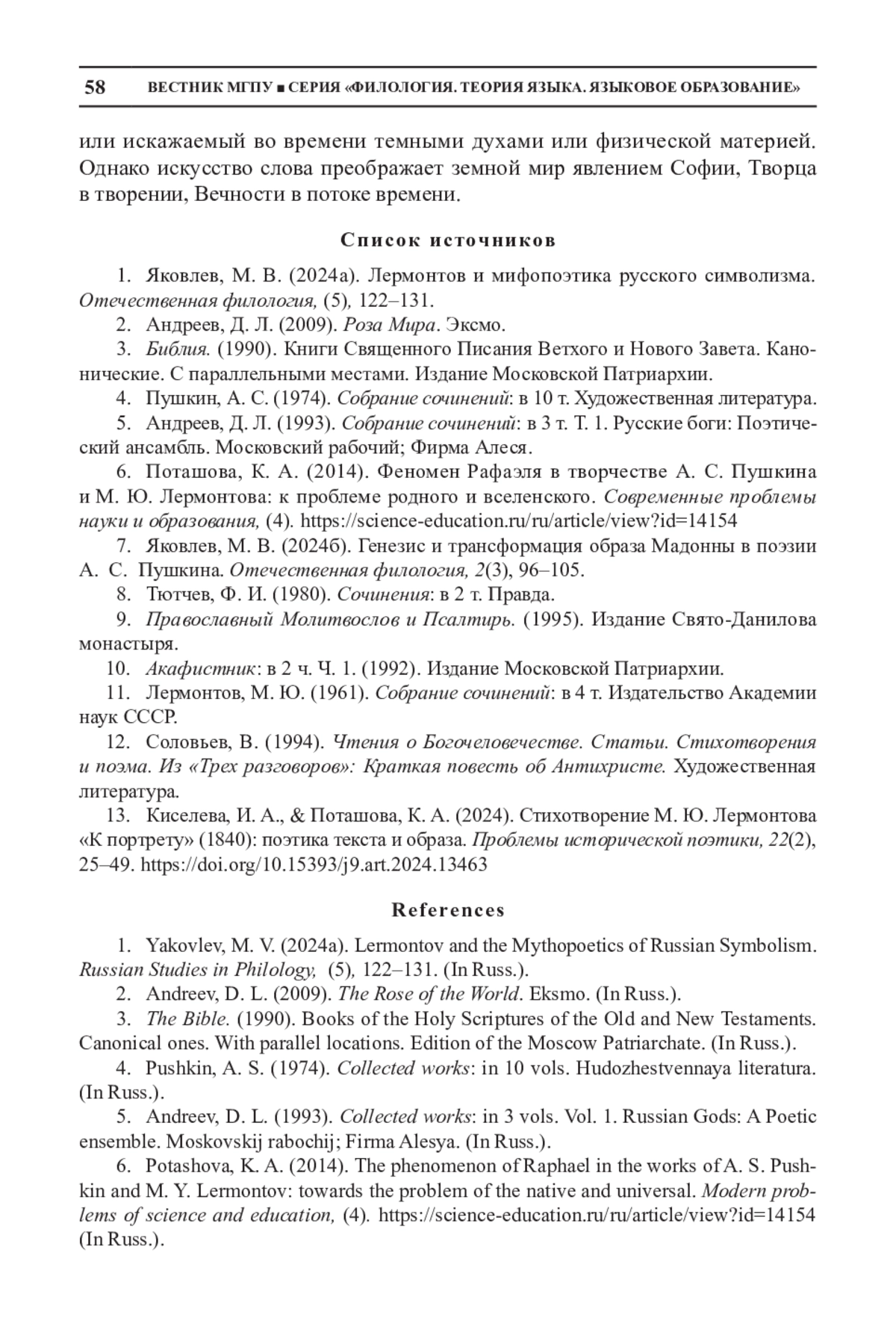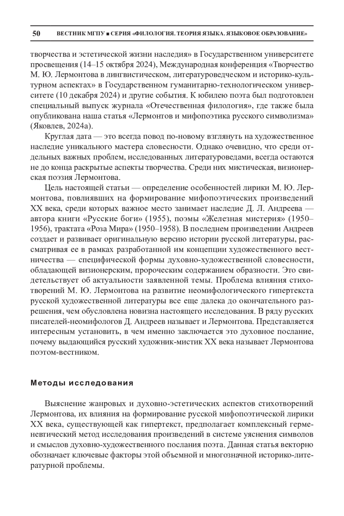 ЯКОВЛЕВ М. В. М. Ю. ЛЕРМОНТОВ И МИФОПОЭТИЧЕСКАЯ КОНЦЕПЦИЯ ВЕСТНИЧЕСТВА Д. Л. АНДРЕЕВА // ВЕСТНИК МГПУ. СЕРИЯ: ФИЛОЛОГИЯ. ТЕОРИЯ ЯЗЫКА. ЯЗЫКОВОЕ ОБРАЗОВАНИЕ. 2025. № 3 (59)