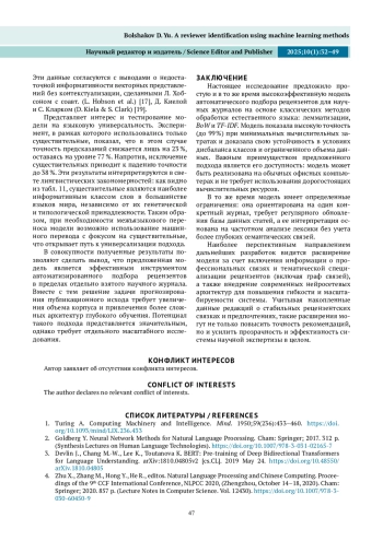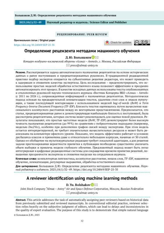 Рассматривается задача автоматического назначения рецензентов на основе исторических данных о ранее поступивших и прорецензированных рукописях. В традиционной редакционной практике подбор экспертов опирается на субъективные решения редактора, что может приводить к задержкам и снижению качества экспертизы. Цель исследования – продемонстрировать, что использование простых моделей обработки естественного языка позволяет эффективно и прозрачно автоматизировать этот процесс. В качестве исходных данных использованы тексты опубликованных и отклоненных рукописей научно-технического журнала «Вестник Концерна ВКО «Алмаз – Антей» (с 2011 по 2024 г.), сопровожденные информацией о назначенных рецензентах. Методологически подход основан на предварительной лемматизации текстов, удалении стоп-слов и знаков пунктуации, а также последующей векторизации с использованием моделей bag-of-words (BoW) и Term Frequency-Inverse Document Frequency (TF-IDF). Близость текстов оценивалось путем вычисления максимального косинусного расстояния между их векторными представлениями. Предполагается, что статья, прорецензированная ранее и демонстрирующая наибольшую близость к поступившей, была рассмотрена рецензентами, которых система может рекомендовать для оценки новой рукописи. Результаты показывают, что простые частотные модели (BoW, TF-IDF) демонстрируют более высокую точность назначения рецензентов (до 99 %) по сравнению с нейросетевыми подходами (например, моделью Doc2Vec), особенно при дополнении графом связей между экспертами. При этом модель остается интерпретируемой, не требует значительных вычислительных ресурсов и может быть реализована на компьютере офисного уровня. Показано, что модель эффективно работает в условиях дисбаланса классов и применима даже к относительно небольшим корпусам, начиная от 30 статей. Однако ее обобщение на мультижурнальные редакции требует локальной адаптации, а для решения задачи прогнозирования вероятности принятия к публикации необходимо существенно увеличить объем выборки и привлечь модели глубокого обучения. Предложенный подход может быть легко интегрирован в цифровые редакционные системы для сокращения времени принятия решений, повышения прозрачности экспертизы и снижения нагрузки на сотрудников журнала.