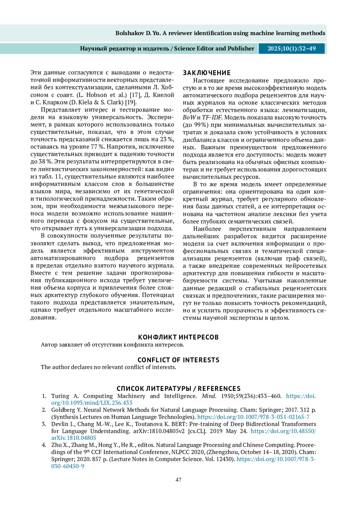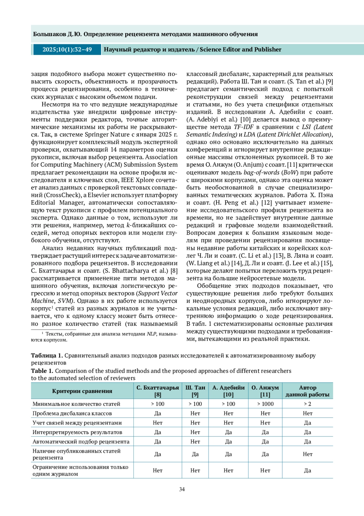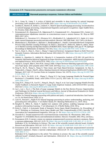 8. Bhattacharya S., Mazumder A., Banerjee A., Bandyopadhyay C., Nandi S. Automated Reviewer Assignment Process Using Machine Learning Technique. In: Patel A., Kesswani N., Mishra M., Meher P., editos. Advances in Machine Learning and Big Data Analytics (ICMLBDA 2023). Cham: Springer; 2025, pp. 87-99. (Springer Proceedings in Mathematics & Statistics. Vol. 441). DOI: 10.1007/978-3-031-51338-1_7