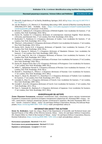 24. van der Maaten L. J. P., Hinton G. E. Visualizing data using t-SNE. Journal of Machine Learning Research. 2008;9(86):2579-2605. Available from: https://www.jmlr.org/papers/volume9/vandermaaten08a/vandermaaten08a.pdf (accessed: 13.02.2025).