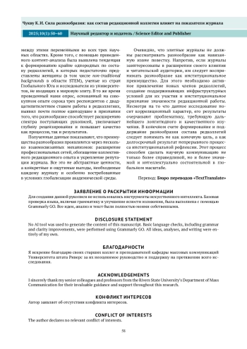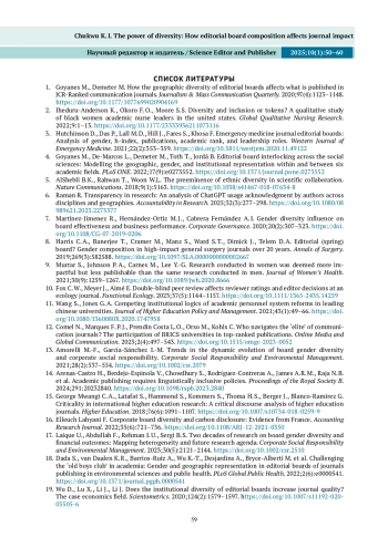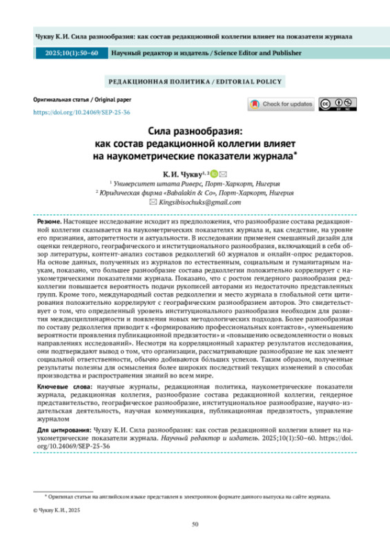 Настоящее исследование исходит из предположения, что разнообразие состава редакционной коллегии сказывается на наукометрических показателях журнала и, как следствие, на уровне его признания, авторитетности и актуальности. В исследовании применен смешанный дизайн для оценки гендерного, географического и институционального разнообразия, включающий в себя обзор литературы, контент-анализ составов редколлегий 60 журналов и онлайн-опрос редакторов. На основе данных, полученных из журналов по естественным, социальным и гуманитарным наукам, показано, что большее разнообразие состава редколлегии положительно коррелирует с наукометрическими показателями журнала. Показано, что с ростом гендерного разнообразия редколлегии повышается вероятность подачи рукописей авторами из недостаточно представленных групп. Кроме того, международный состав редколлегии и место журнала в глобальной сети цитирования положительно коррелируют с географическим разнообразием авторов. Это свидетельствует о том, что определенный уровень институционального разнообразия необходим для развития междисциплинарности и появления новых методологических подходов. Более разнообразная по составу редколлегия приводит к «формированию профессиональных контактов», «уменьшению вероятности проявления публикационной предвзятости» и «повышению осведомленности о новых направлениях исследований». Несмотря на корреляционный характер результатов исследования, они подтверждают вывод о том, что организации, рассматривающие разнообразие не как элемент социальной ответственности, обычно добиваются бо́льших успехов. Таким образом, полученные результаты полезны для осмысления более широких последствий текущих изменений в способах производства и распространения знаний во всем мире.