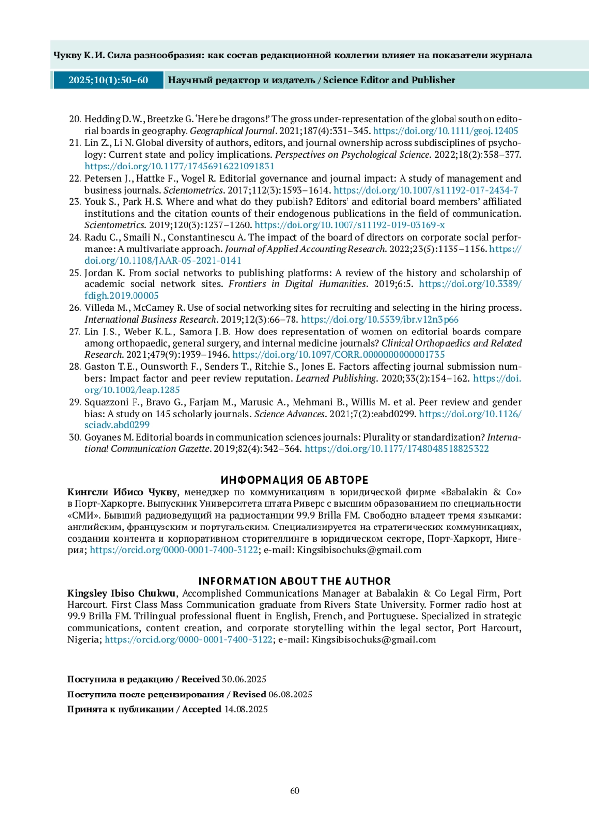 1. Goyanes M., Demeter M. How the geographic diversity of editorial boards affects what is published in JCR-Ranked communication journals. Journalism & Mass Communication Quarterly. 2020;97(4):1123-1148. DOI: 10.1177/1077699020904169