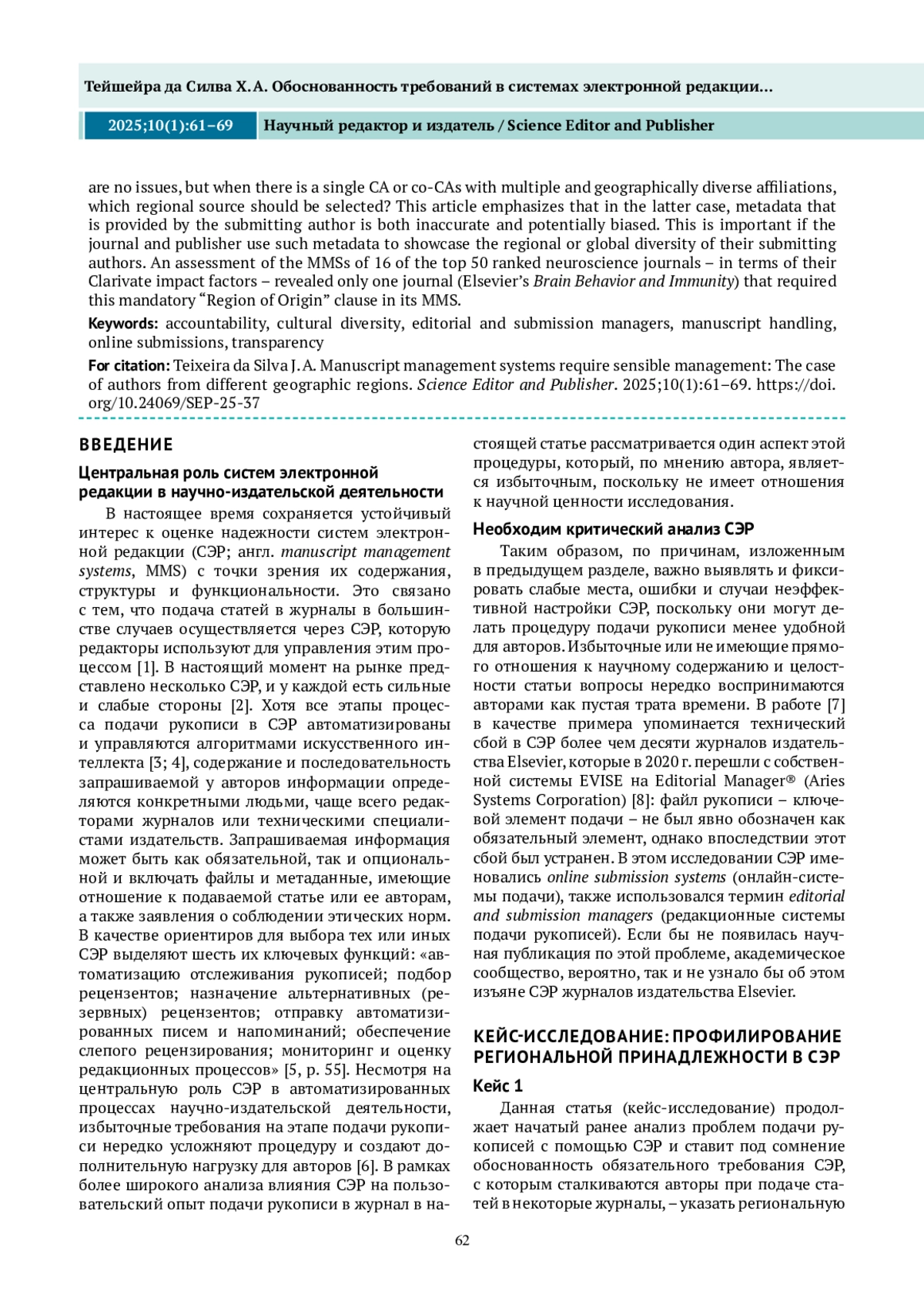 В настоящее время сохраняется устойчивый интерес к оценке надежности систем электронной редакции (СЭР; англ. manuscript management systems, MMS) с точки зрения их содержания, структуры и функциональности. Это связано с тем, что подача статей в журналы в большинстве случаев осуществляется через СЭР, которую редакторы используют для управления этим процессом [1]. В настоящий момент на рынке представлено несколько СЭР, и у каждой есть сильные и слабые стороны [2].