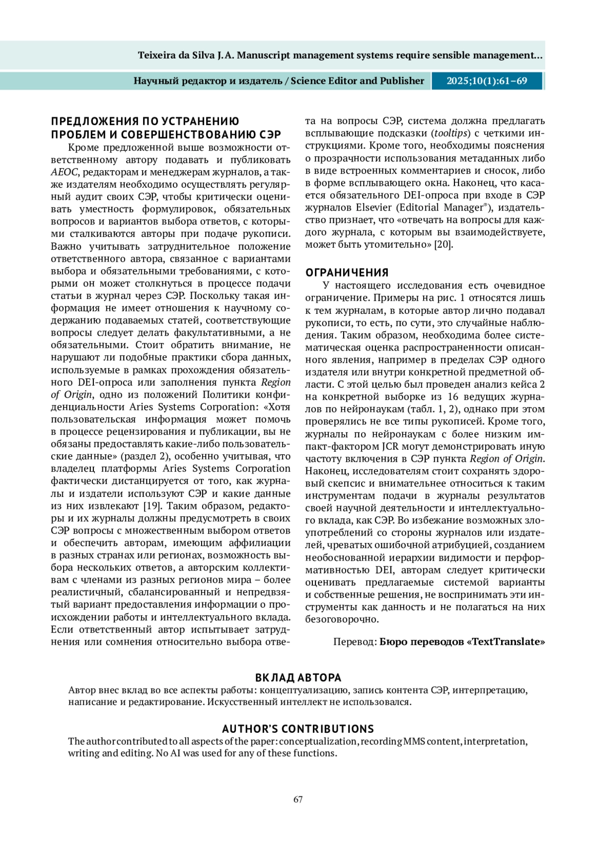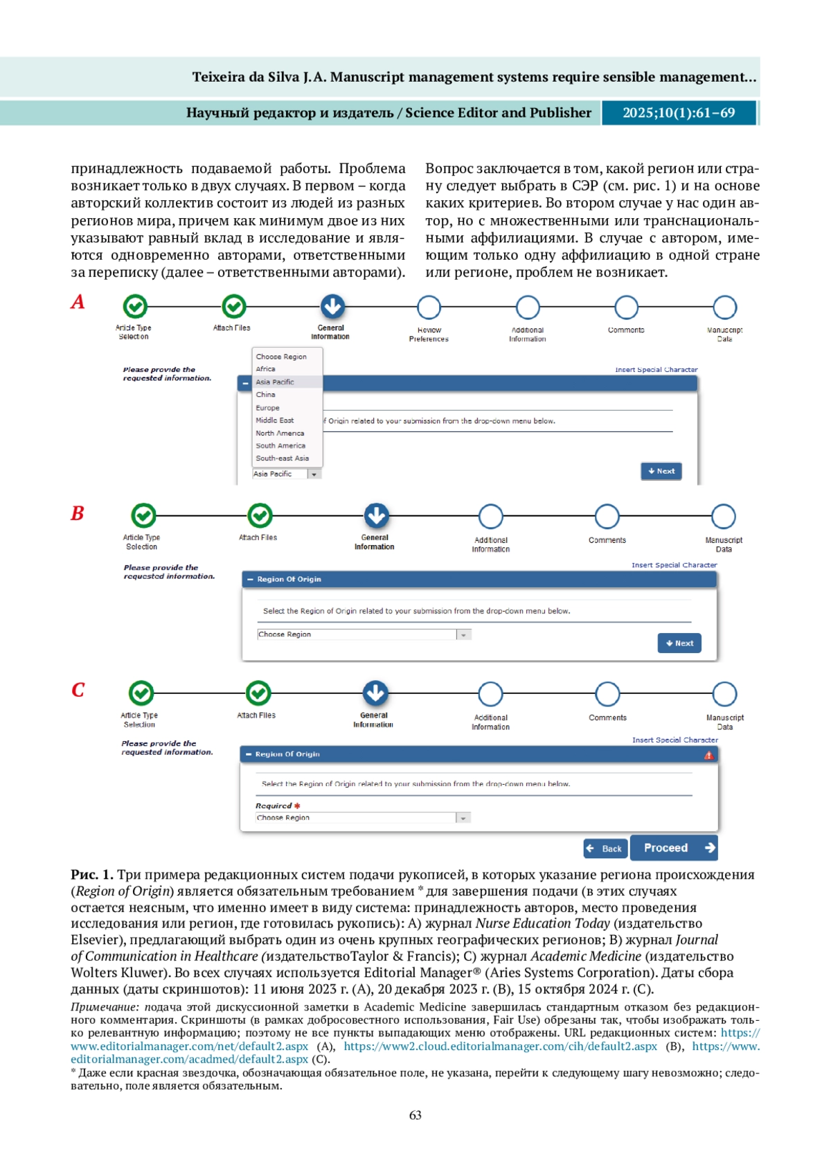 Системы электронной редакции (manuscript management systems, MMS) используются для облегчения процедуры подачи статей в журналы. Они проводят авторов через эту процедуру с помощью перечня вопросов, часть из которых носит опциональный характер, а часть является обязательной. Обязательные вопросы, по мнению автора данного исследования, не должны касаться несущественных моментов и выходить за рамки научного содержания статьи. В работе кратко рассматривается практика включения в систему электронной редакции индексируемых журналов обязательного вопроса, при ответе на который автор, подающий рукопись (то есть ответственный автор), должен указать региональную или географическую принадлежность выполненной работы, исследования или интеллектуального вклада. Если у единственного ответственного автора одна аффилиация, выбор очевиден и проблем не возникает. Но какой следует указать регион, когда у ответственного автора или нескольких ответственных соавторов аффилиации множественные и географически разнесенные? В статье показано, что в таких случаях метаданные, вводимые при подаче рукописи, оказываются неточными и потенциально предвзятыми, и это особенно важно, если на их основе журнал демонстрирует широту географического охвата авторского состава. Анализ систем электронной редакции 16 из 50 ведущих журналов по нейронаукам (на основе импакт-фактора Clarivate) выявил лишь один журнал (Brain, Behavior, and Immunity, издательство Elsevier), в системе которого предусмотрен обязательный пункт Region of Origin («Регион принадлежности»).