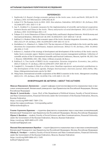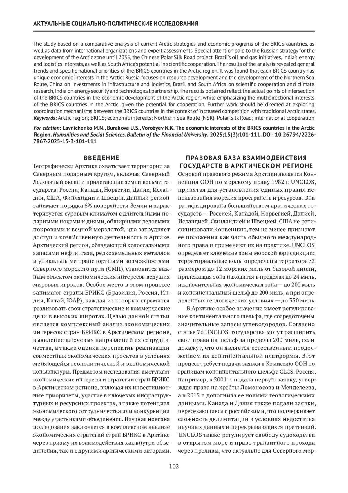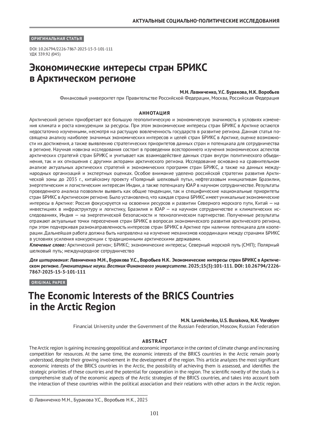 ЛАВНИЧЕНКО М. Н., БУРАКОВА У. С., ВОРОБЬЕВ Н. К. ЭКОНОМИЧЕСКИЕ ИНТЕРЕСЫ СТРАН БРИКС В АРКТИЧЕСКОМ РЕГИОНЕ // ГУМАНИТАРНЫЕ НАУКИ. ВЕСТНИК ФИНАНСОВОГО УНИВЕРСИТЕТА. 2025. ТОМ 15, № 3