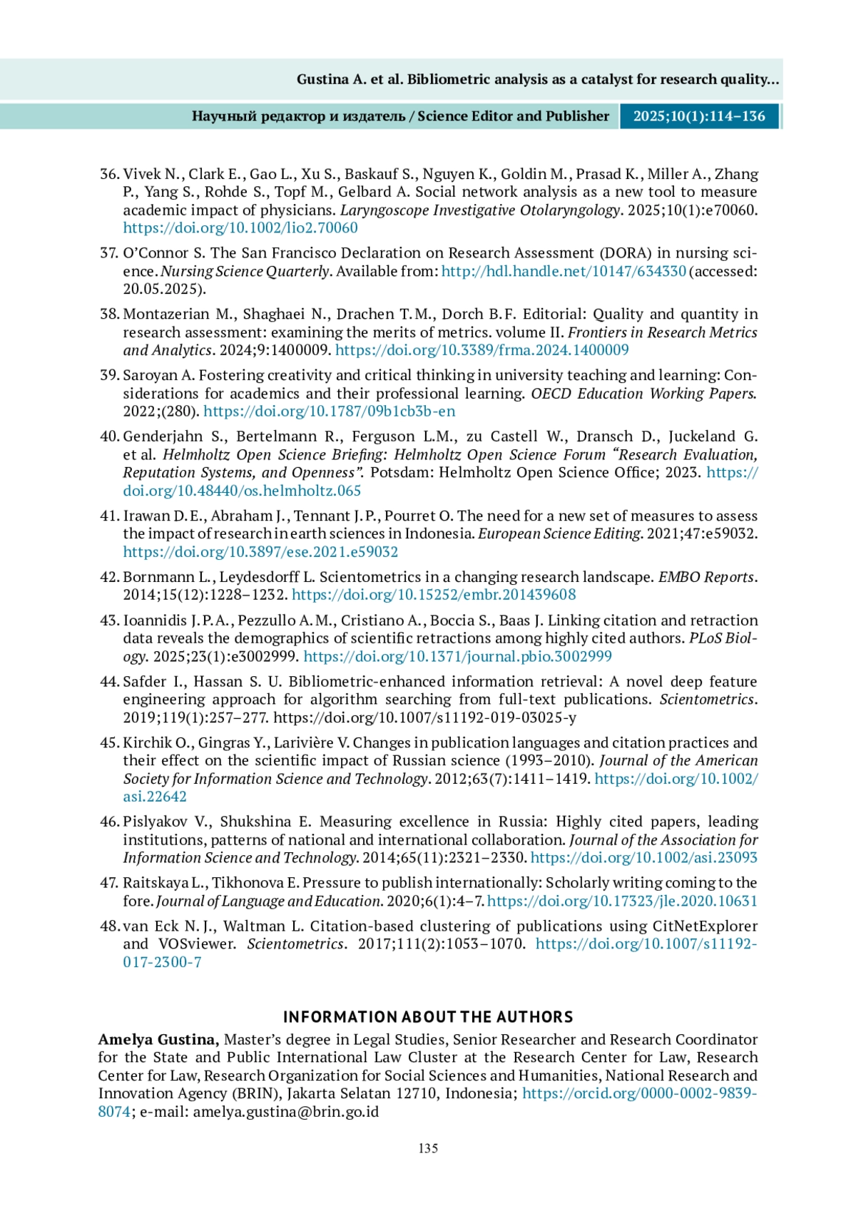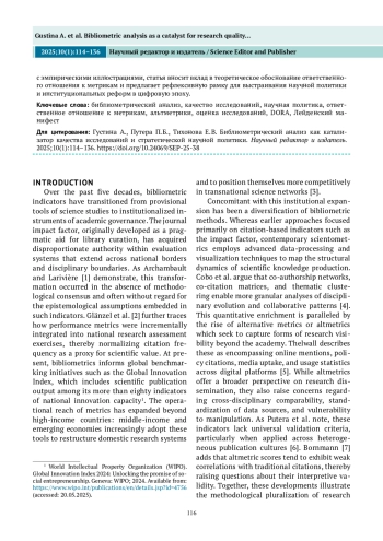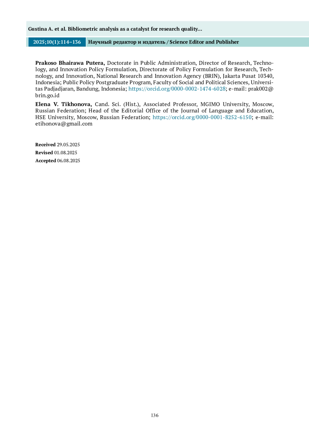 GUSTINA A., PUTERA P. B., TIKHONOVA E. V. БИБЛИОМЕТРИЧЕСКИЙ АНАЛИЗ КАК КАТАЛИЗАТОР КАЧЕСТВА ИССЛЕДОВАНИЙ И СТРАТЕГИЧЕСКОЙ НАУЧНОЙ ПОЛИТИКИ // НАУЧНЫЙ РЕДАКТОР И ИЗДАТЕЛЬ. 2025. № 1, ТОМ 10