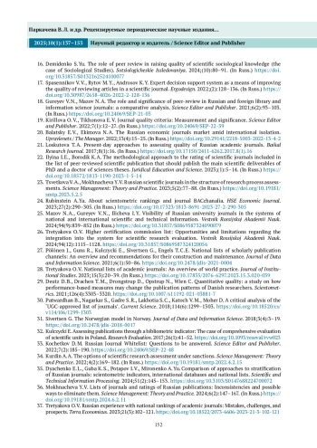 35. Дьяченко Е. Л., Губа К. С., Потапов И. В., Мироненко А. Ю. Сравнение подходов к стратификации российских журналов: наукометрические индикаторы, международные базы данных и национальные списки. Научно-техническая информация. Серия 1: Организация и методика информационной работы. 2024;(5):13-21. DOI: 10.36535/0548-0019-2024-05-3