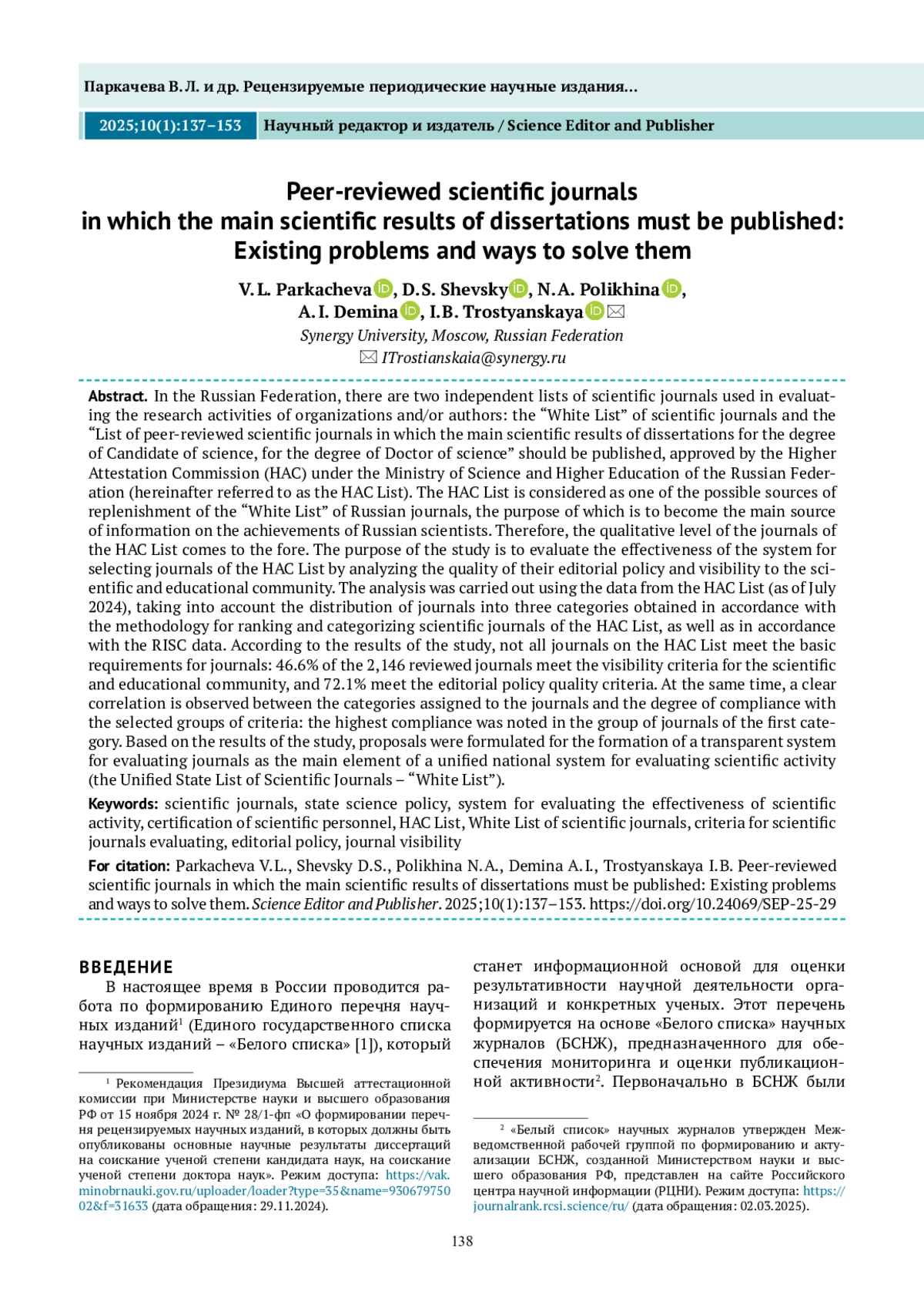 В настоящее время в России проводится работа по формированию Единого перечня научных изданий1 (Единого государственного списка научных изданий – «Белого списка» [1]), который станет информационной основой для оценки результативности научной деятельности организаций и конкретных ученых. Этот перечень формируется на основе «Белого списка» научных журналов (БСНЖ), предназначенного для обеспечения мониторинга и оценки публикационной активности2.