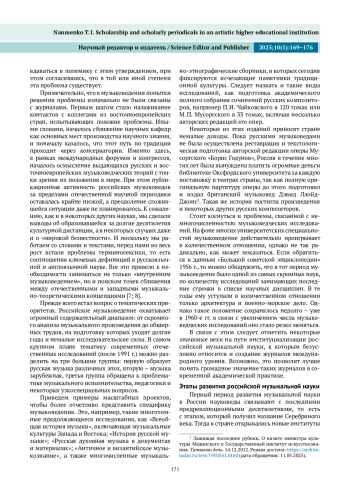 Предмет данной статьи – наука о музыкальном искусстве, то есть музыковедение, сквозь призму которого затронуты вопросы, связанные с научными периодическими изданиями международного уровня. Можно предположить, что проблемы, актуальные для музыковедения в контексте создания и поддержки подобных изданий, в той или иной степени характерны и для других научных дисциплин. Однако некоторые отличия музыковедения от большинства наук все же имеются. Прежде всего музыкальная наука в глазах представителей «серьезных» научных специальностей не может претендовать на безоговорочный авторитет хотя бы в силу некоторой закрытости самого предмета. Известна фраза, сказанная еще в советские времена в связи с обсуждением претендентов на получение Сталинской премии: «Музыка – самое темное дело»1. И хотя с тех пор многое изменилось, музыковедение по-прежнему остается на периферии научного поля. Оно не входит ни в систему академических институтов, ни в структуру университетов. С первых послереволюционных лет и до настоящего времени его основной институциональной базой остаются консерватории [1–3].